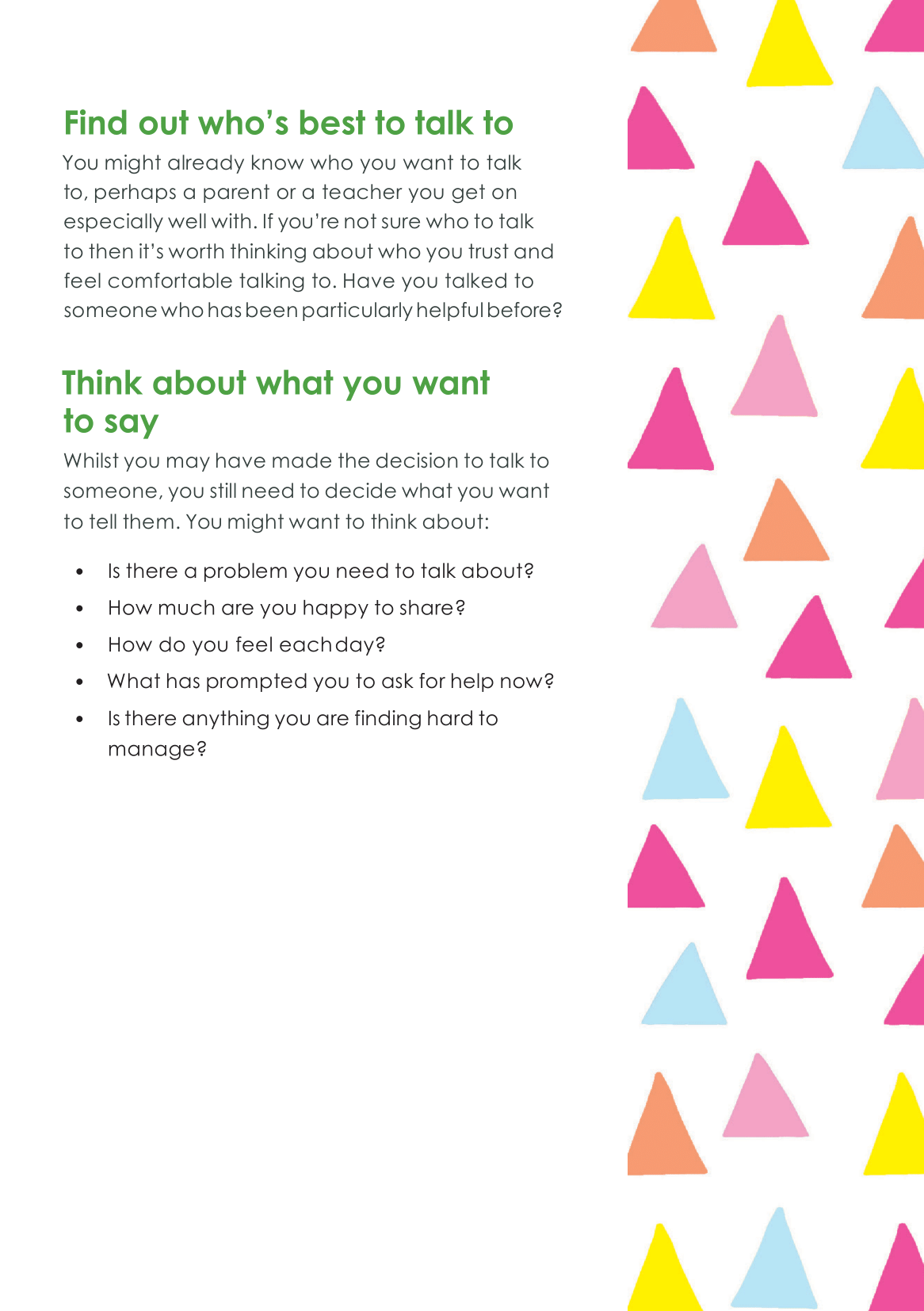 You might already know who you want to talk to, perhaps a parent or a teacher you get on especially well with. If you’re not sure who to talk to then it’s worth thinking about who you trust and feel comfortable talking to. Have you talked to someone who has been particularly helpful before?