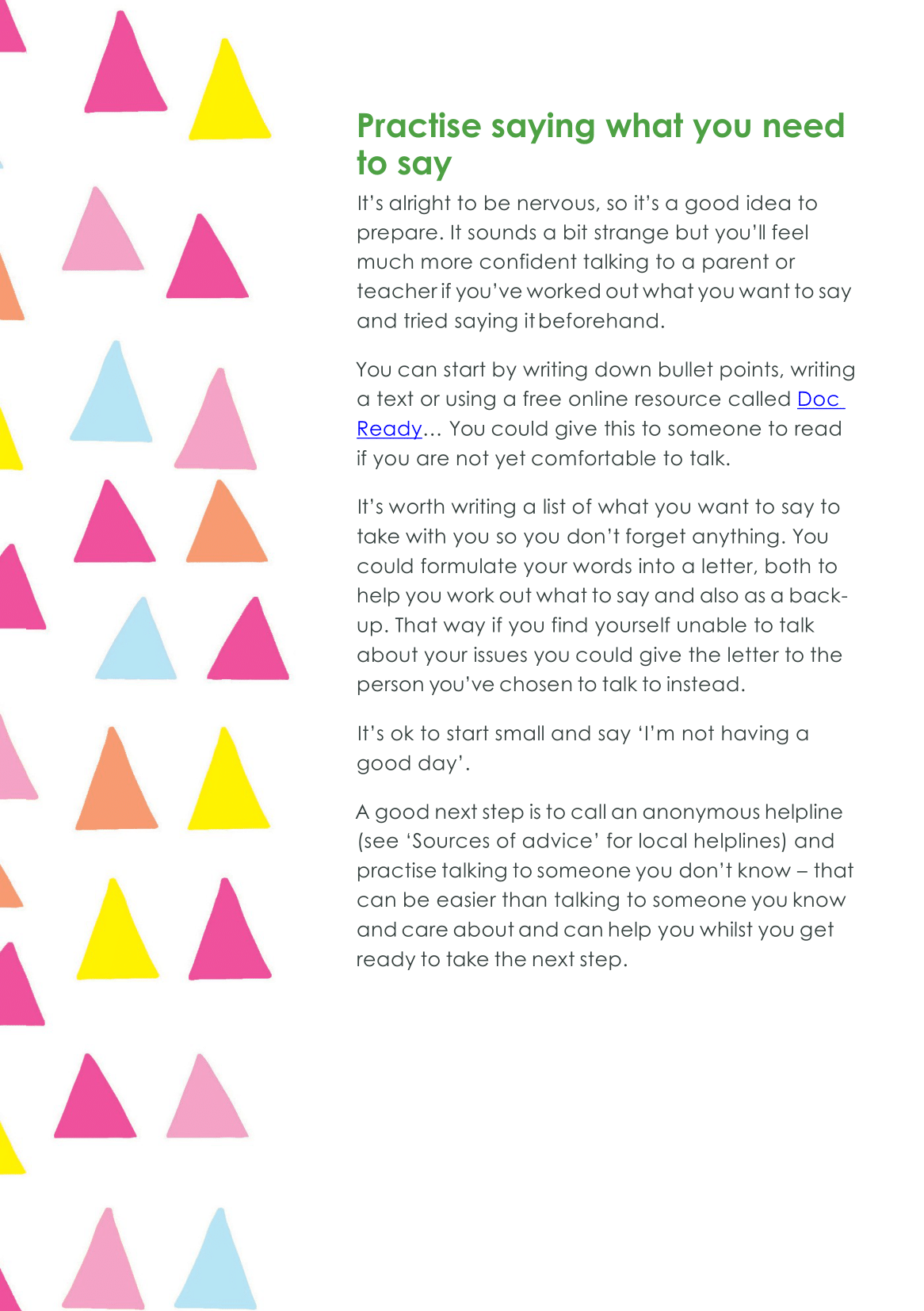 It’s worth writing a list of what you want to say to take with you so you don’t forget anything. You could formulate your words into a letter, both to help you work out what to say and also as a back- up. That way if you find yourself unable to talk about your issues you could give the letter to the person you’ve chosen to talk to instead.