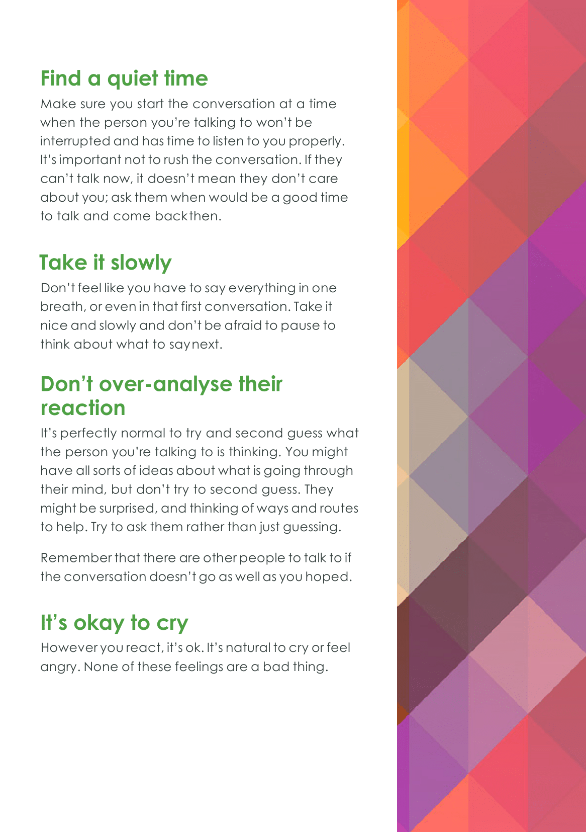 Make sure you start the conversation at a time when the person you’re talking to won’t be interrupted and has time to listen to you properly. It’s important not to rush the conversation. If they can’t talk now, it doesn’t mean they don’t care about you; ask them when would be a good time to talk and come back then.