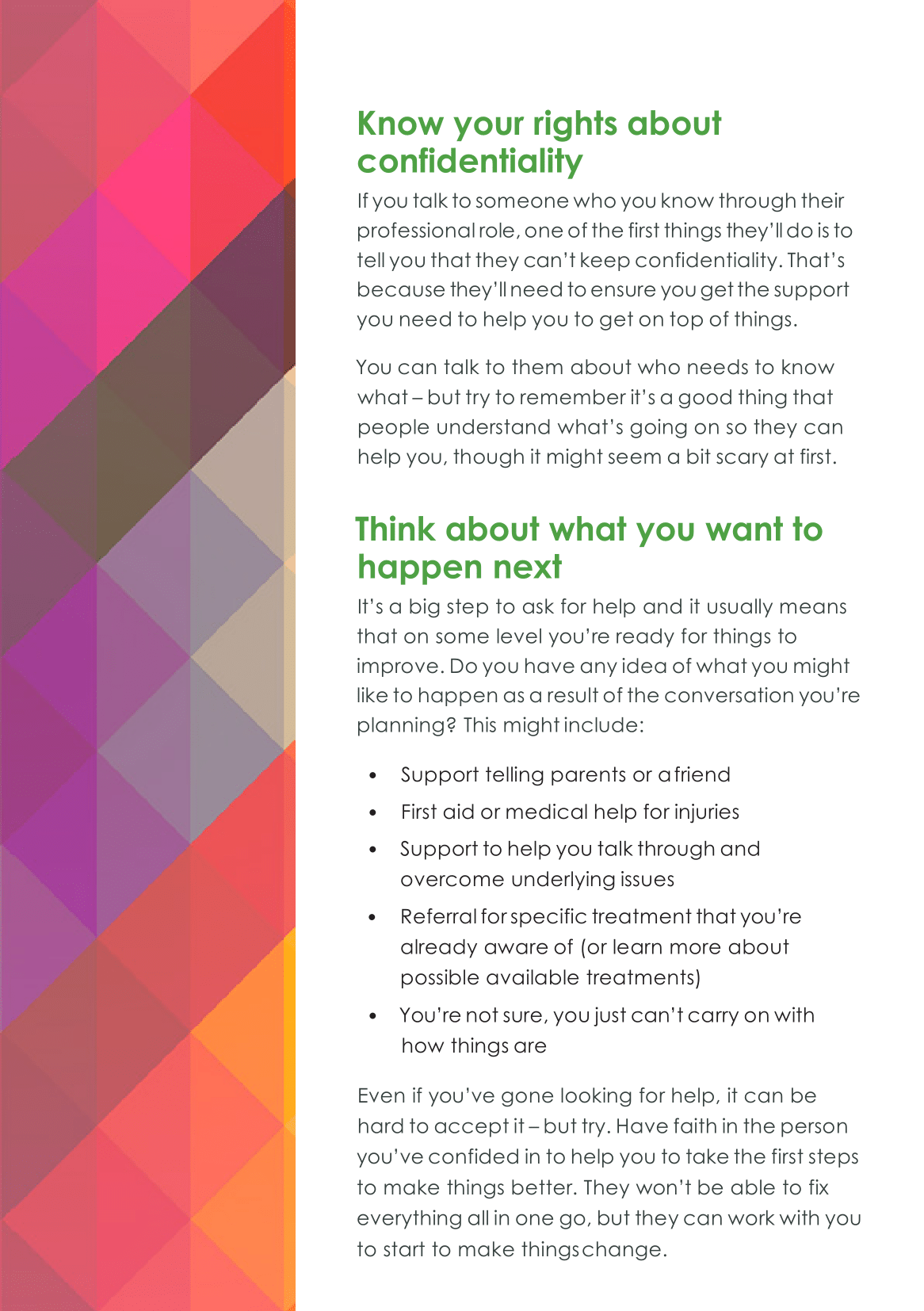 Whilst you may have made the decision to talk to someone, you still need to decide what you want to tell them. You might want to think about: