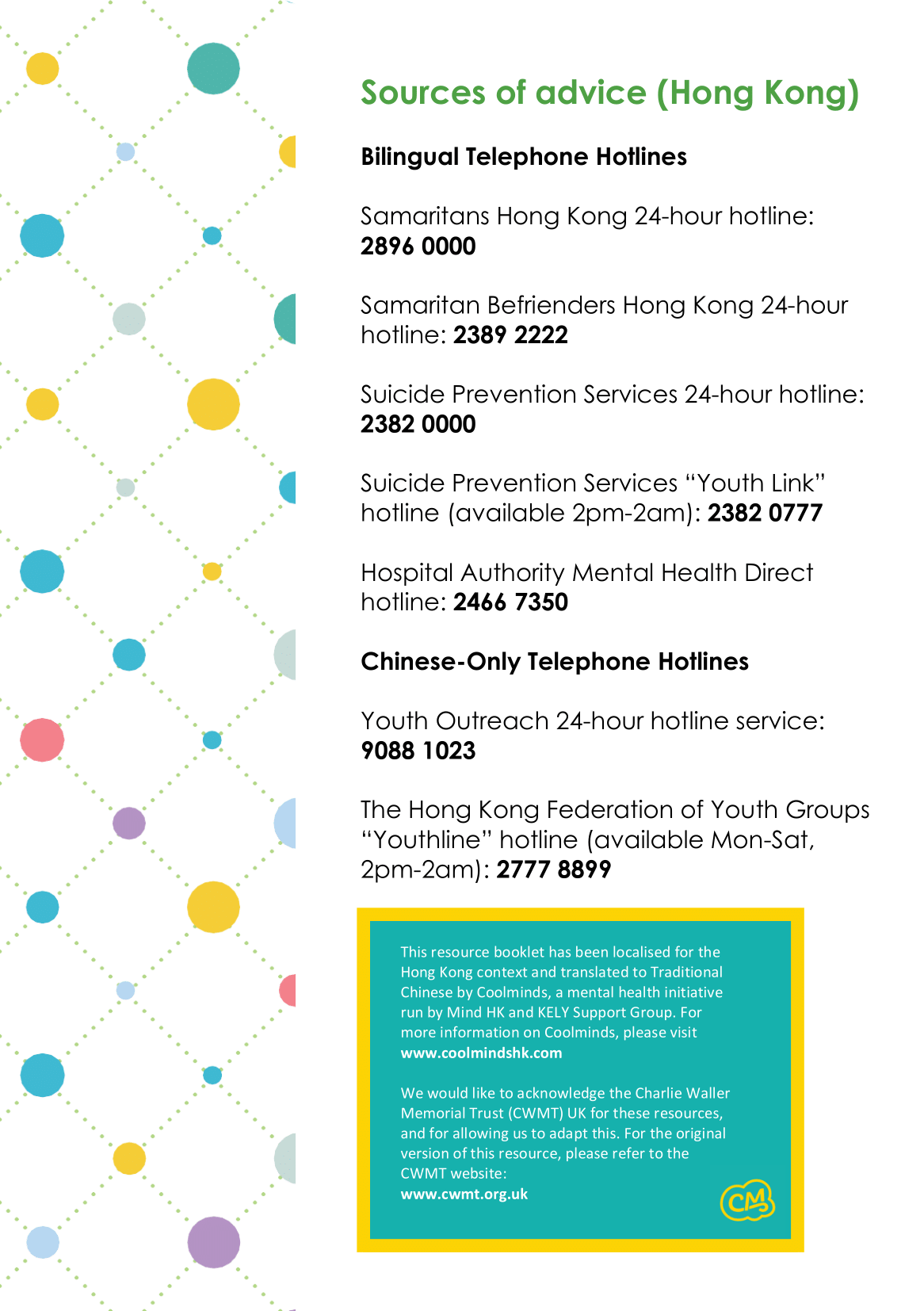 This resource booklet has been localised for the Hong Kong context and translated to Traditional Chinese by Coolminds, a mental health initiative run by Mind HK and KELY Support Group. For more information on Coolminds, please visit www.coolmindshk.com