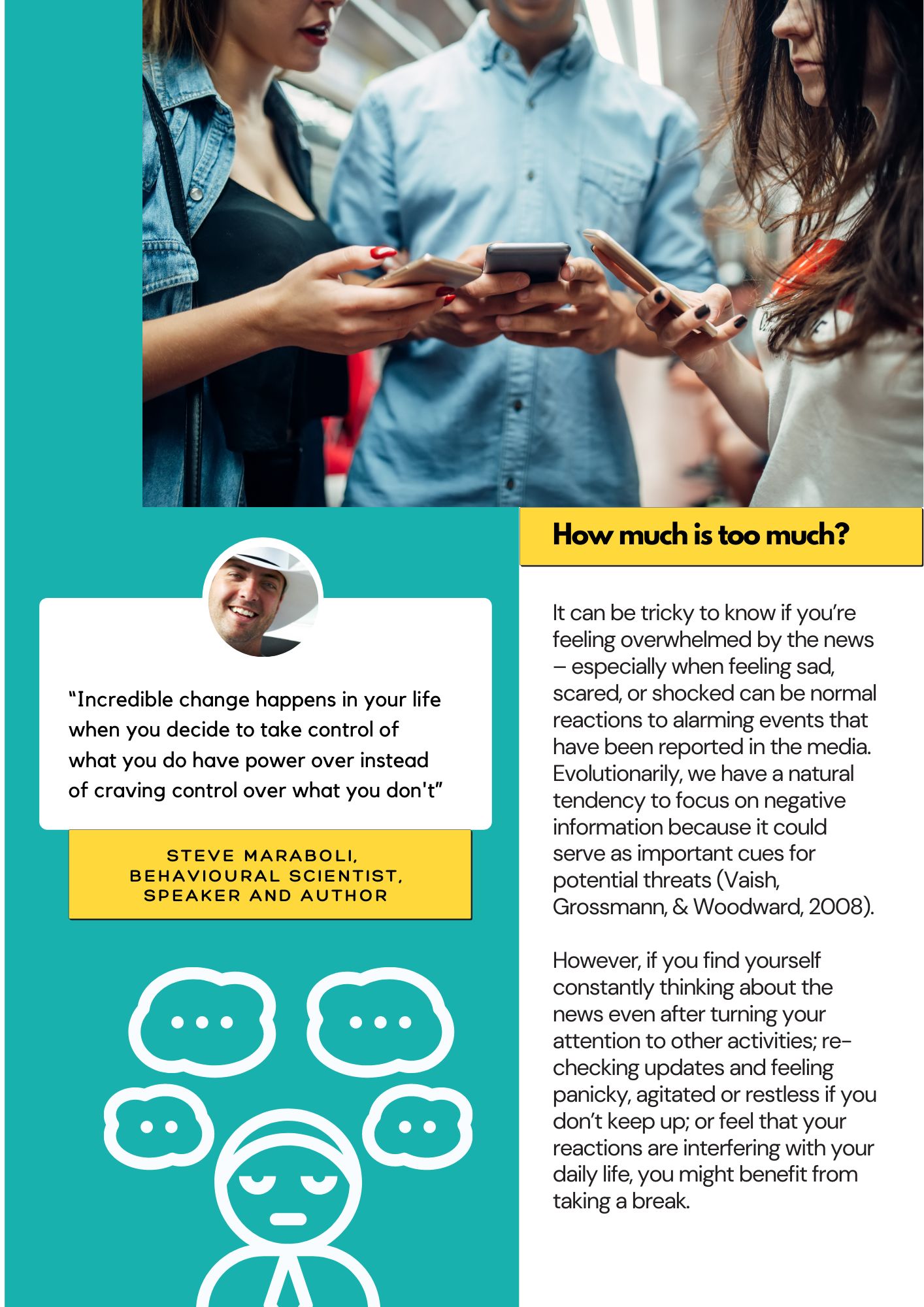 It can be tricky to know if you’re feeling overwhelmed by the news – especially when feeling sad, scared, or shocked can be normal reactions to alarming events that have been reported in the media. Evolutionarily, we have a natural tendency to focus on negative information because it could serve as important cues for potential threats (Vaish, Grossmann, & Woodward, 2008).