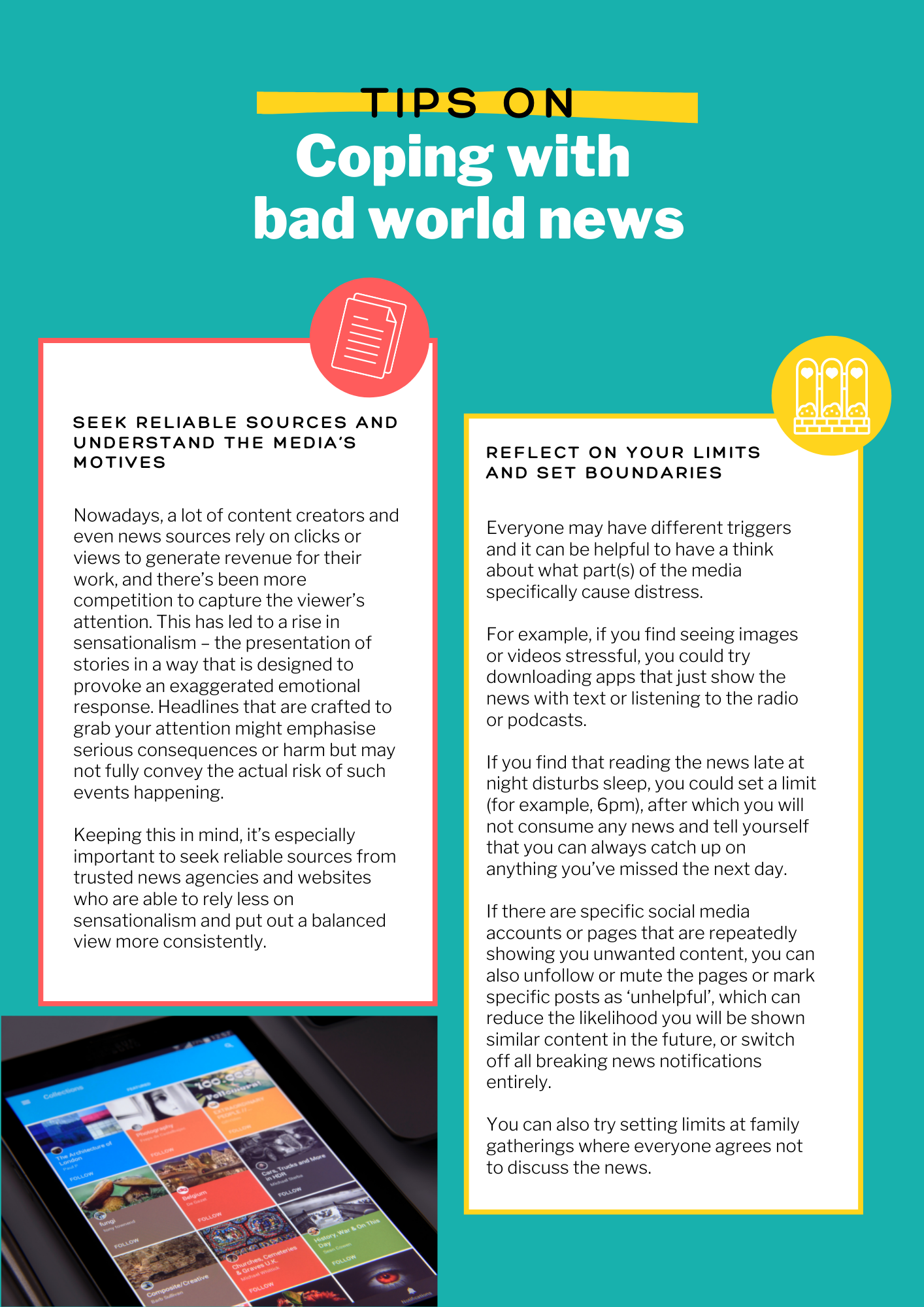 For example, if you find seeing images or videos stressful, you could try downloading apps that just show the news with text or listening to the radio or podcasts.