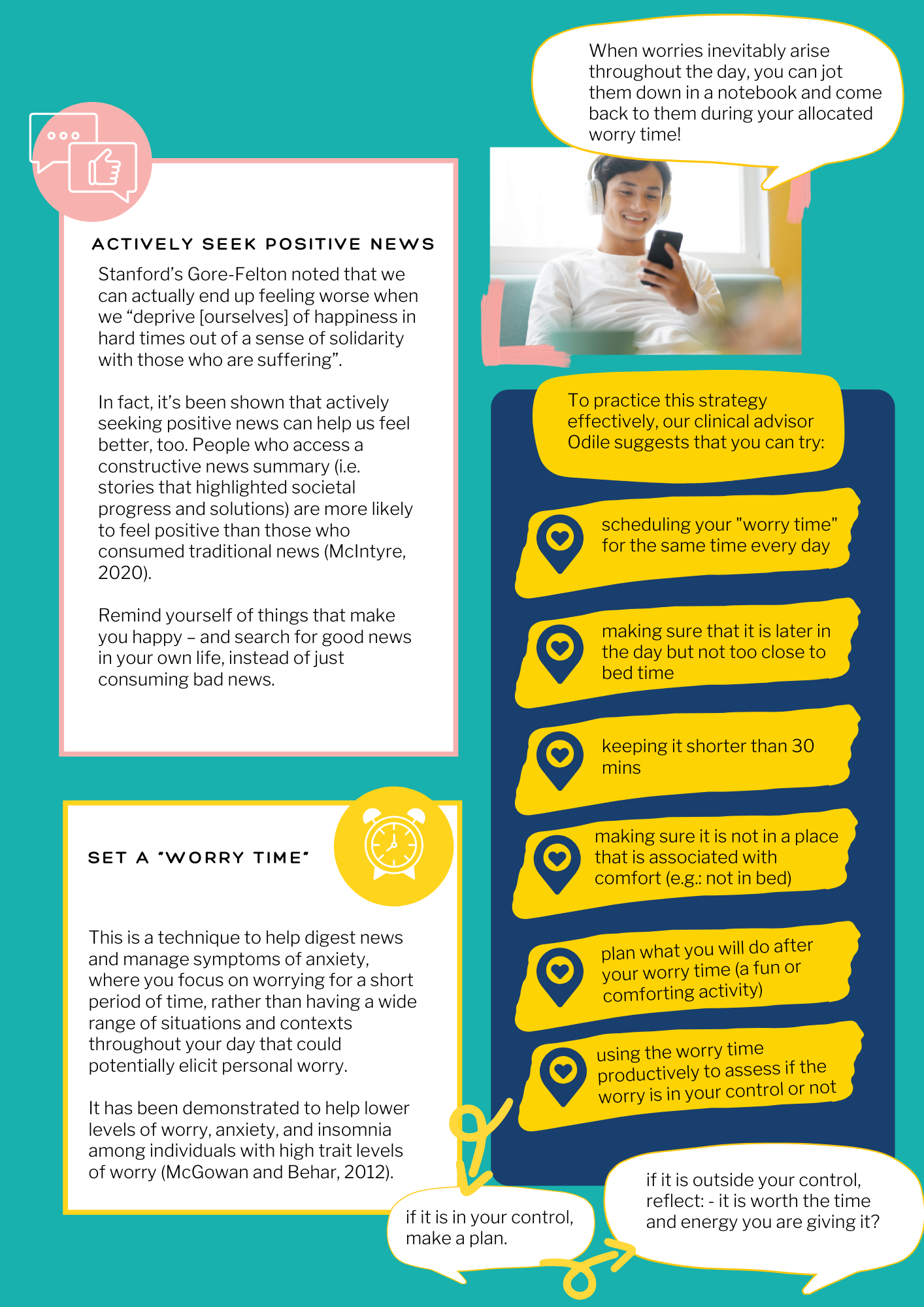 - using the worry time productively to assess if the worry is in your control or not (if it is in your control, make a plan; if it is outside your control, reflect on whether it is worth the time and energy you are giving it)