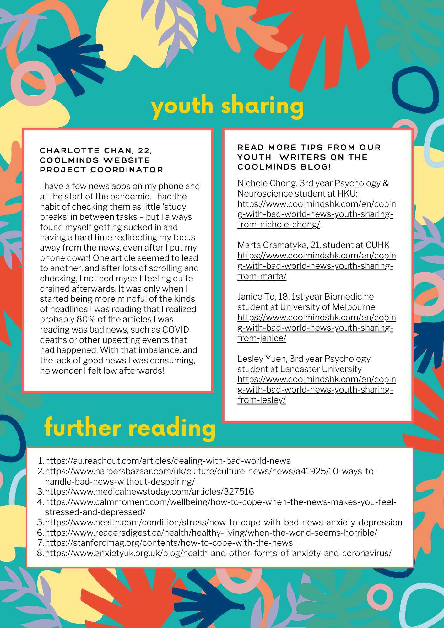 Lesley Yuen, 3rd year Psychology student at Lancaster University: https://www.coolmindshk.com/en/coping-with-bad-world-news-youth-sharing-from-lesley/