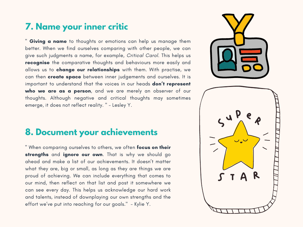 “Giving a name to thoughts or emotions can help us manage them better. When we find ourselves comparing with other people, we can give such judgments a name, for example, Critical Carol. This helps us recognise the comparative thoughts and behaviours more easily and allows us to change our relationships with them. With practise, we can then create space between inner judgements and ourselves. It is important to understand that the voices in our heads don’t represent who we are as a person, and we are merely an observer of our thoughts. Although negative and critical thoughts may sometimes emerge, it does not reflect reality.” – Lesley Y.