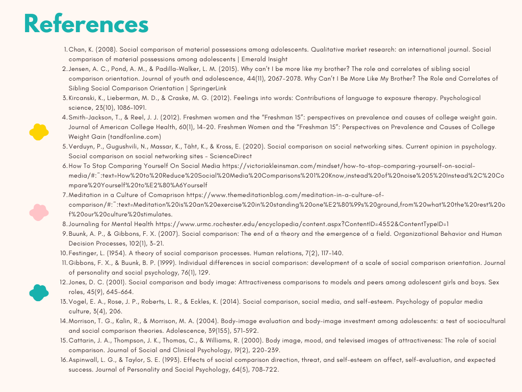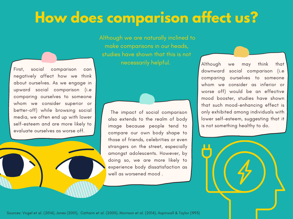 The impact of social comparison also extends to the realm of body image because people tend to compare our own body shape to those of friends, celebrities or even strangers on the street, especially amongst adolescents (Jones, 2001). However, by doing so, we are more likely to experience body dissatisfaction as well as worsened mood (Cattarin et al., 2000; Morrison et al., 2014).
