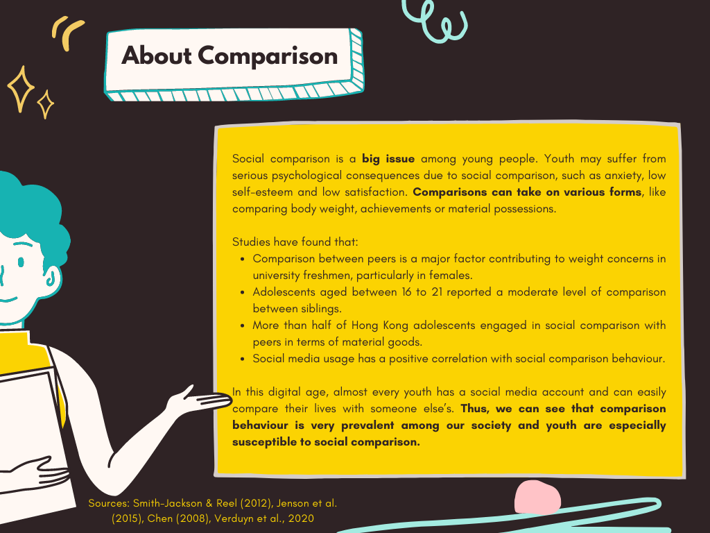 Social comparison is a major issue among young people. Youth may suffer from serious psychological consequences due to social comparison, such as anxiety, low self-esteem and low satisfaction. Comparisons can take on various forms, like comparing body weight, achievements or material possessions. Smith-Jackson & Reel (2012) found that comparison between peers is a major factor contributing to weight concerns in university freshmen, particularly in females. Another study also showed that adolescents aged between 16 to 21 reported a moderate level of comparison between siblings (Jenson et al., 2015). Moreover, Chen (2008) showed that more than half of the Hong Kong adolescents, who participated in the study, engaged in social comparison with peers in terms of material goods. It is suggested that social media usage has a positive correlation with social comparison behaviour (Verduyn et al., 2020). In this digital age, almost every youth has a social media account and can easily compare their lives with someone else’s. Thus, we can see that comparison behaviour is very prevalent among our society and youth are especially susceptible to social comparison.