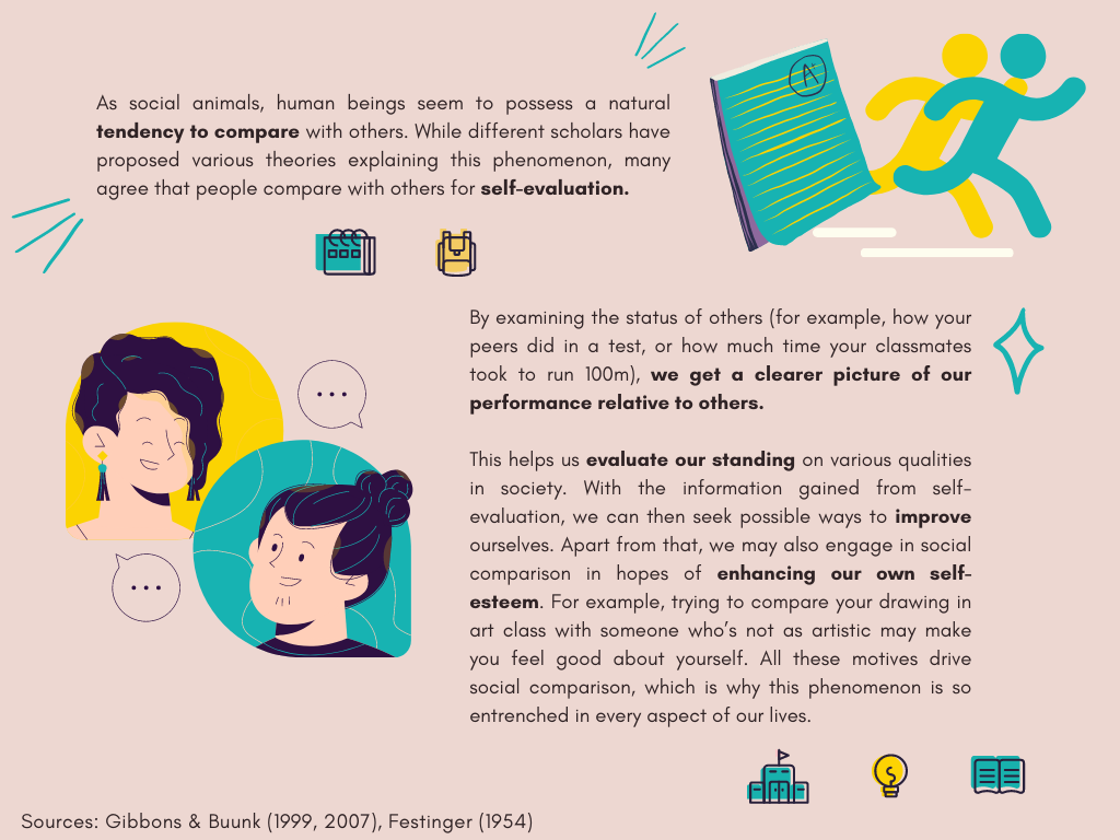 As social animals, human-beings seem to possess a natural tendency to compare with others. While different scholars have proposed various theories explaining this phenomenon, many agree that people compare with others for self-evaluation (Gibbons & Buunk, 1999). By examining the status of others (for example, how your peers did in a test, or how much time your classmates took to run 100m), we get a clearer picture of our performance relative to others. This helps us evaluate our standing on various qualities in society (Buunk & Gibbons, 2007). With the information gained from self-evaluation, we can then seek possible ways to improve ourselves (Festinger, 1954). Apart from that, we may also engage in social comparison in hopes of enhancing our own self-esteem (Gibbons & Buunk, 1999). For example, trying to compare your drawing in art class with someone who’s not as artistic may make you feel good about yourself. All these motives drive social comparison, which is why this phenomenon is so entrenched in every aspect of our lives.