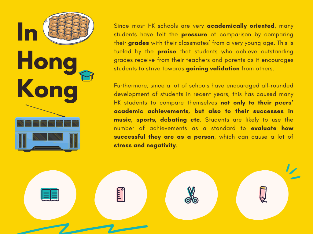 Since most HK schools are very academically-oriented, many students have felt the pressure of comparison by comparing their grades with their classmates’ from a very young age. This is fueled by the praise that students who achieve outstanding grades receive from their teachers and parents as it encourages students to strive towards gaining validation from others.