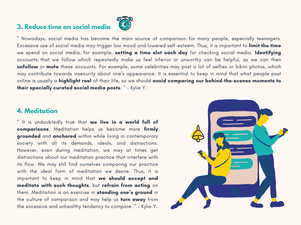 “Nowadays, social media has become a main source of comparison for many people, especially teenagers. Excessive use of social media may trigger low mood and lowered self-esteem. Thus, it is important to limit the time we spend on social media, for example, setting a time slot each day for checking social media. Identifying accounts that we follow which repeatedly make us feel inferior or unworthy can be helpful, as we can then unfollow or mute these accounts. For example, some celebrities may post a lot of selfies or bikini photos, which may contribute towards insecurity about one’s appearance. It is essential to keep in mind that what people post online is usually a highlight reel of their life, so we should avoid comparing our behind-the-scenes moments to their specially curated social media posts.” – Kylie Y.