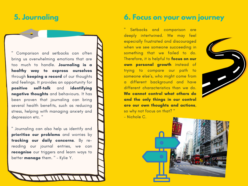 “Comparison and setbacks can often bring us overwhelming emotions that are too much to handle. Journaling is a healthy way to express ourselves through keeping a record of our thoughts and feelings. It provides an opportunity for positive self-talk and identifying negative thoughts and behaviours. It has been proven that journaling can bring several health benefits, such as reducing stress, helping with managing anxiety and depression etc. In addition, journaling can also help us identify and prioritise our problems and worries by tracking our daily concerns. By re-reading our journal entries, we can recognise our triggers and learn ways to better manage them.” – Kylie Y.