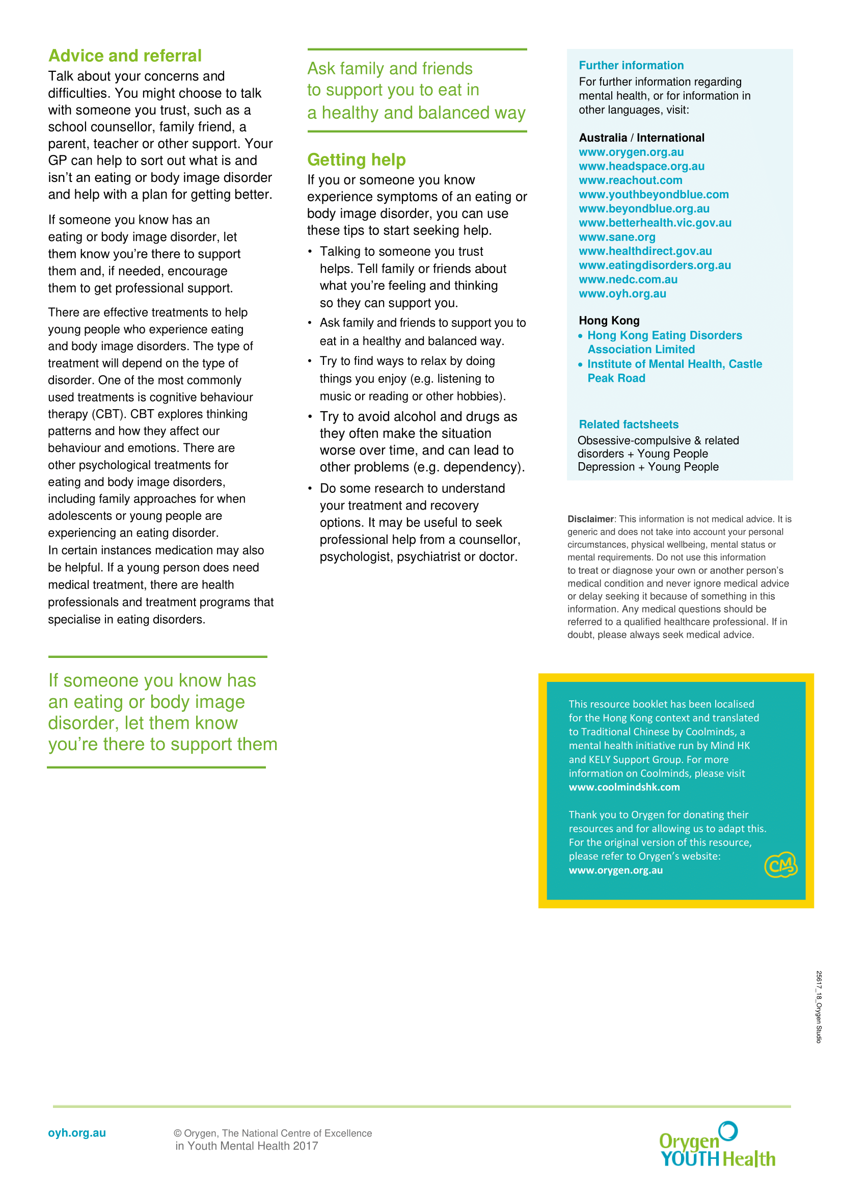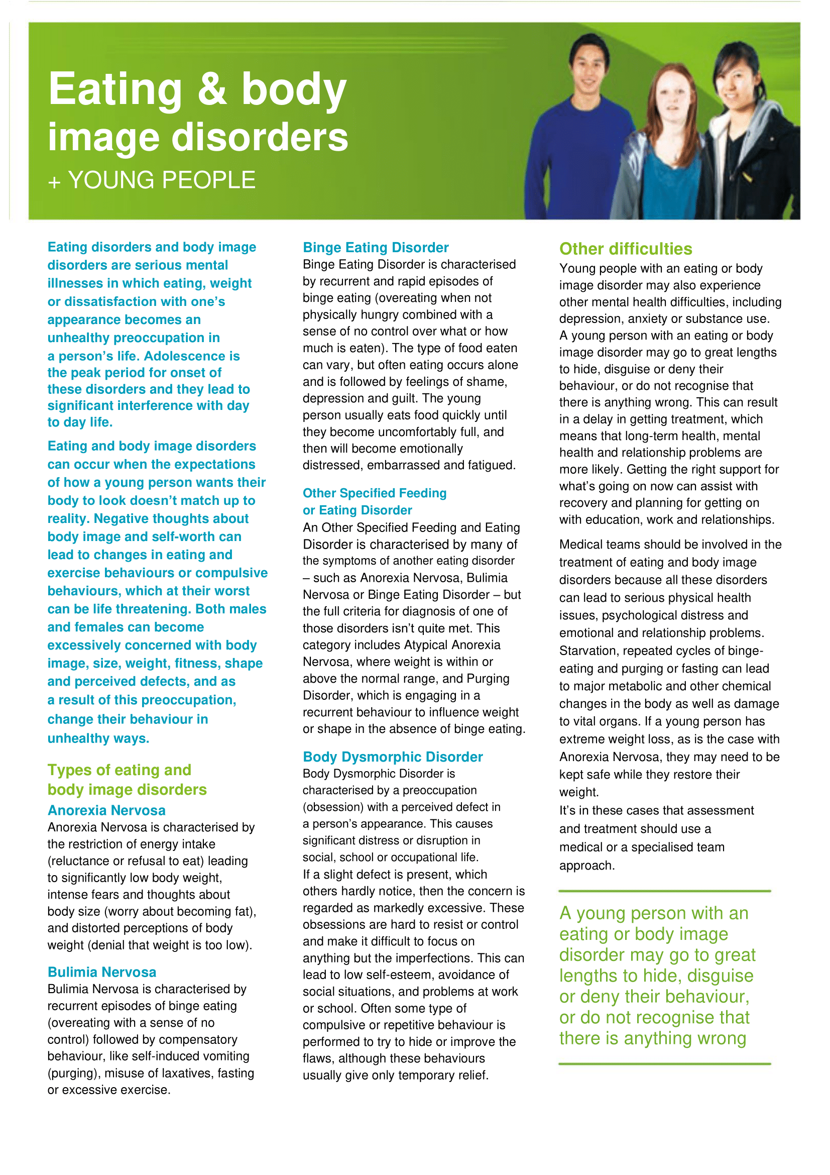 Young people with an eating or body image disorder may also experience other mental health difficulties, including depression, anxiety or substance use. A young person with an eating or body image disorder may go to great lengths to hide, disguise or deny their behaviour, or do not recognise that there is anything wrong. This can result in a delay in getting treatment, which means that long-term health, mental health and relationship problems are more likely. Getting the right support for what’s going on now can assist with recovery and planning for getting on with education, work and relationships.