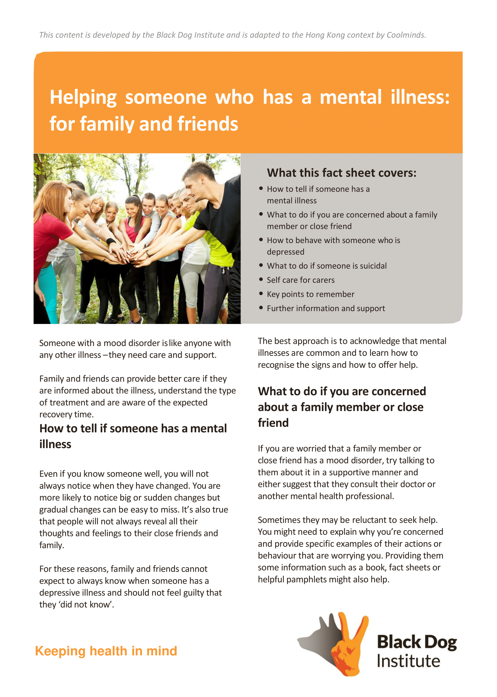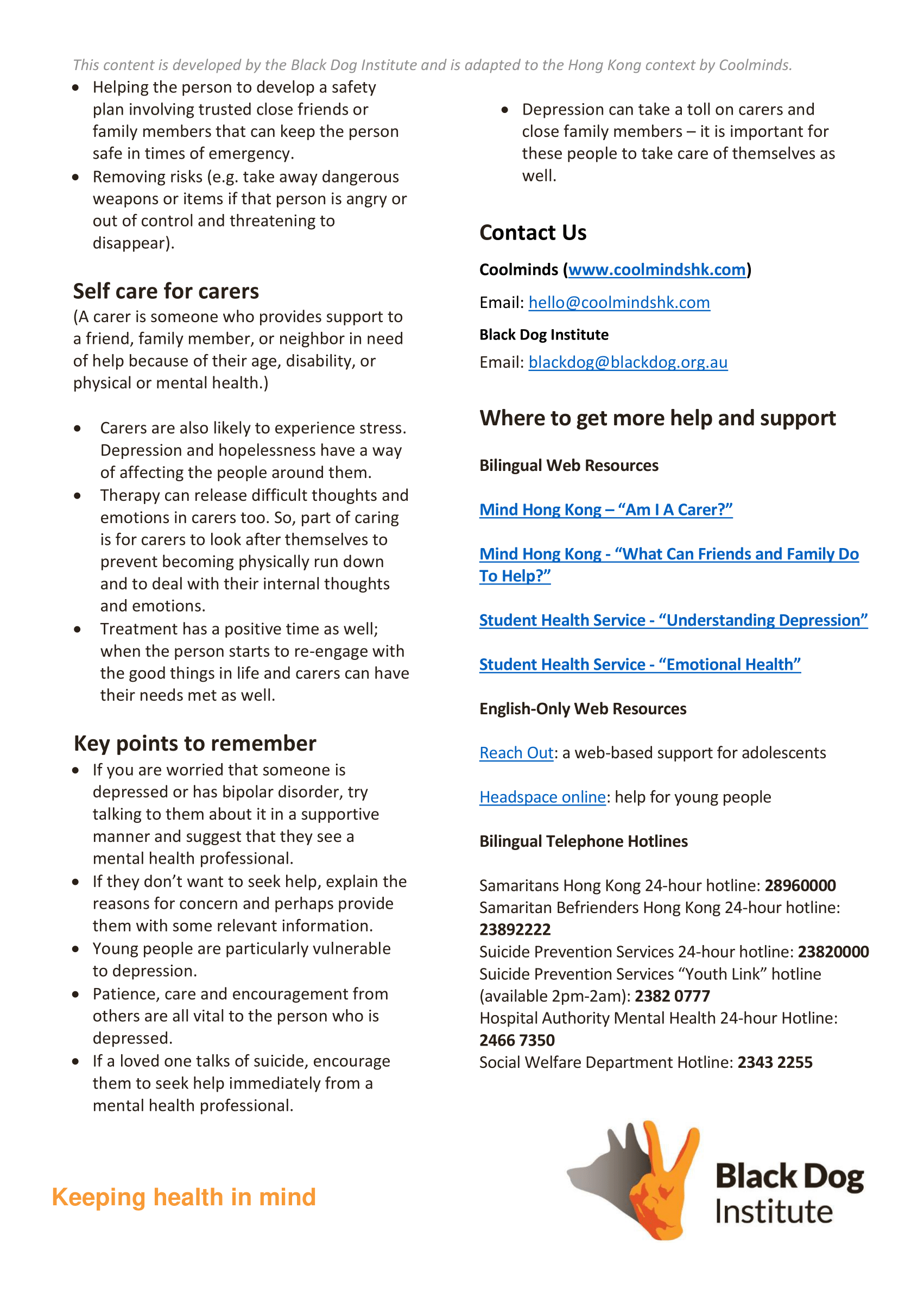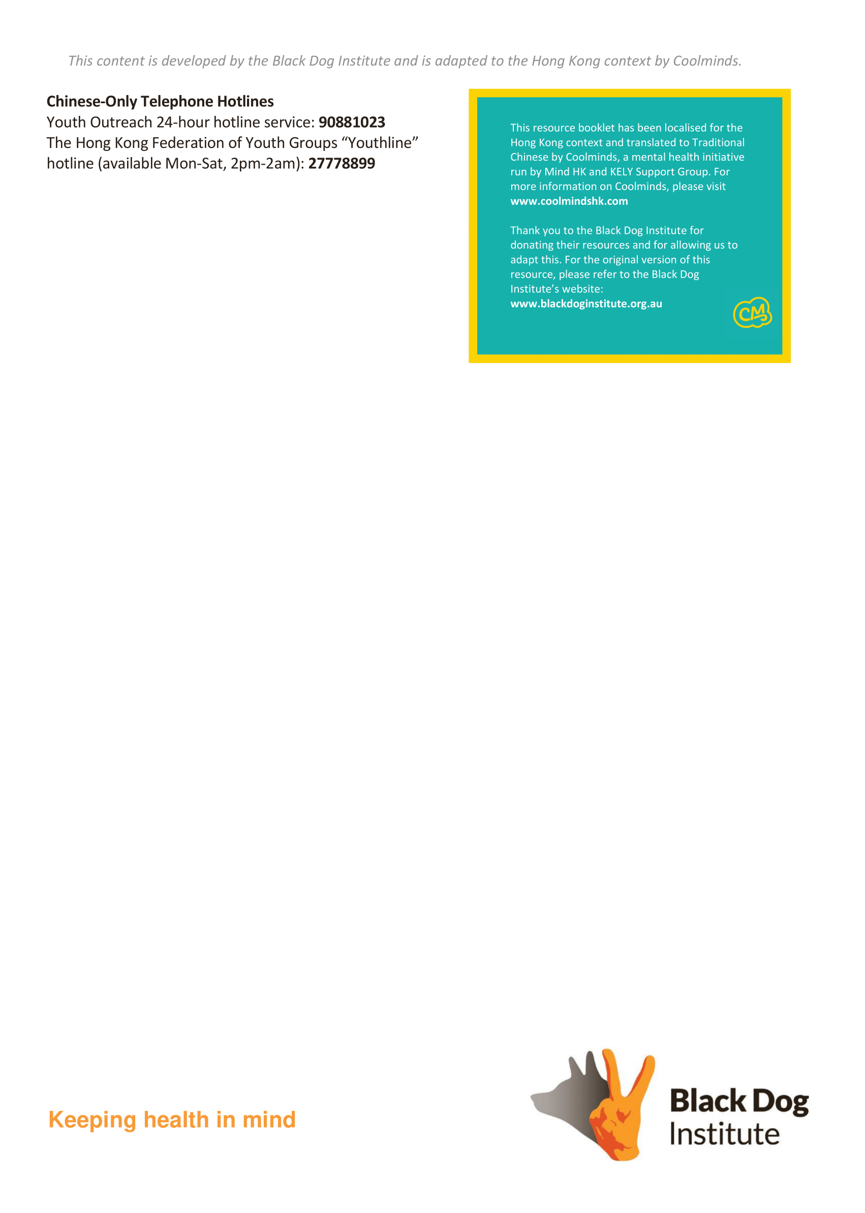 This resource booklet has been localised for the Hong Kong context and translated to Traditional Chinese by Coolminds, a mental health initiative run by Mind HK and KELY Support Group. For more information on Coolminds, please visit www.coolmindshk.com