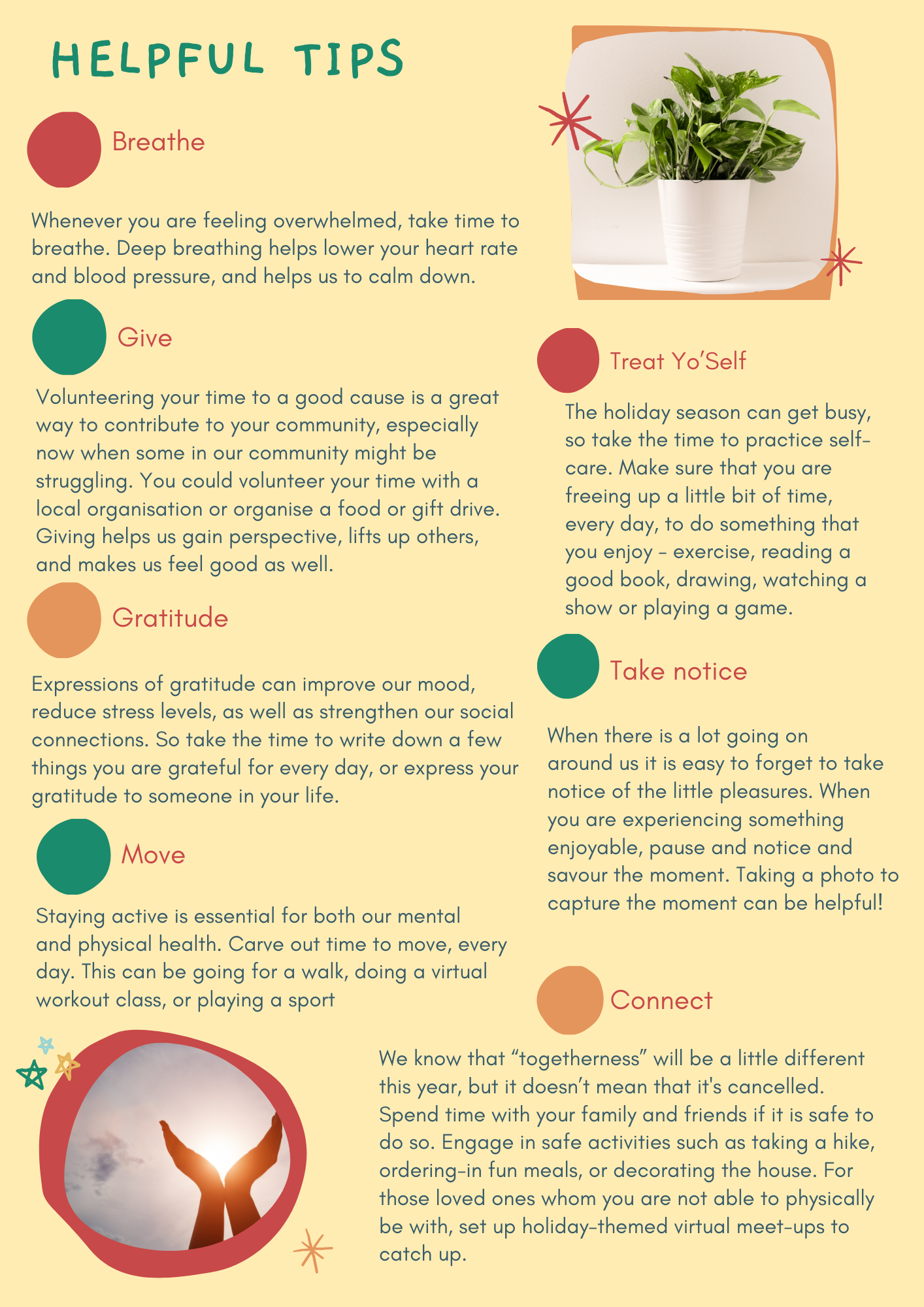 The holiday season can get busy, so take the time to practice self-care. Make sure that you are freeing up a little bit of time, every day, to do something that you enjoy – exercise, reading a good book, drawing, watching a show or playing a game.