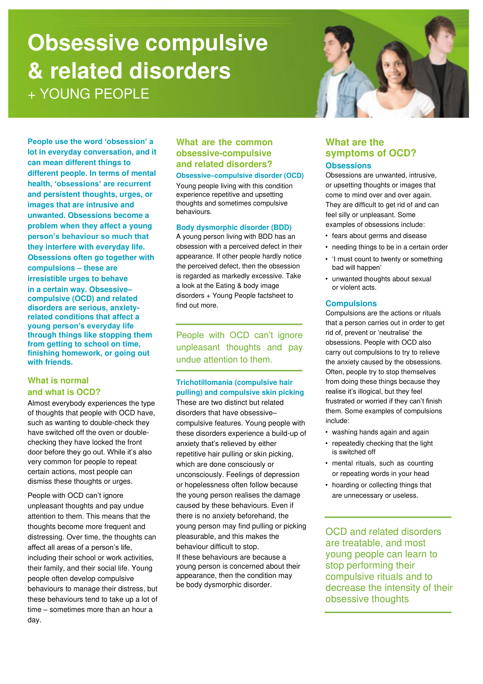OCD and related disorders are treatable, and most young people can learn to stop performing their compulsive rituals and to decrease the intensity of their obsessive thoughts