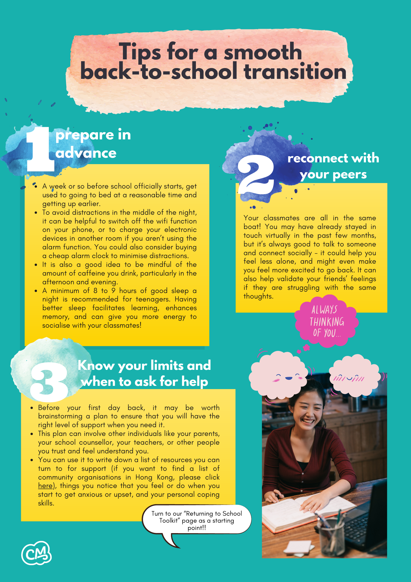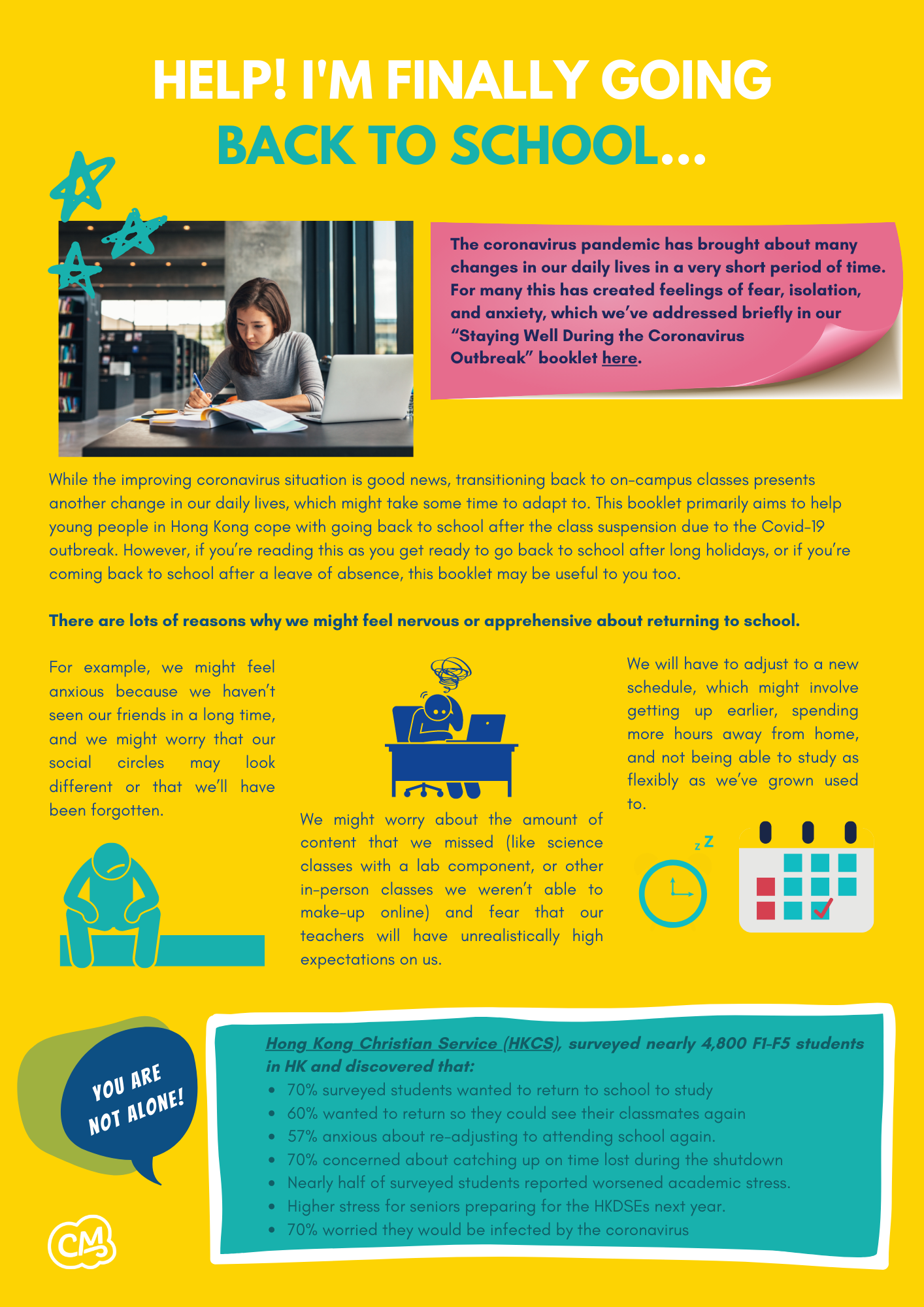 While the improving coronavirus situation is good news, transitioning back to on-campus classes presents another change in our daily lives, which might take some time to adapt to. This booklet primarily aims to help young people in Hong Kong cope with going back to school after the class suspension due to the Covid-19 outbreak. However, if you’re reading this as you get ready to go back to school after long holidays, or if you’re coming back to school after a leave of absence, this booklet may be useful to you too.