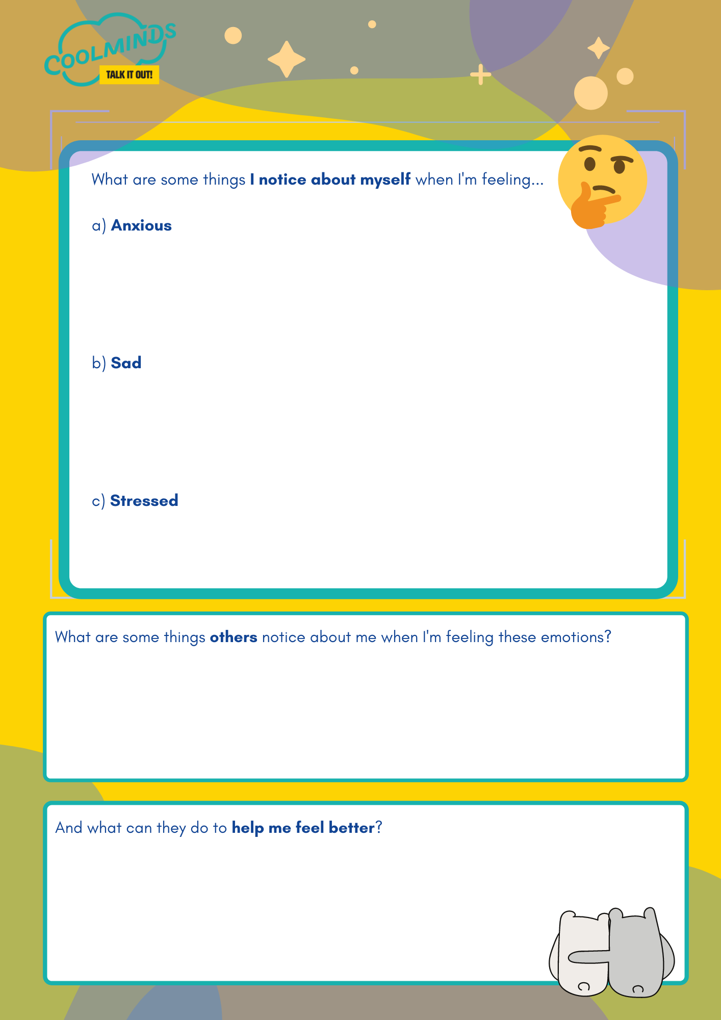 - You can use it to write down a list of resources you can turn to for support (if you want to find a list of community organisations in Hong Kong, please click here), things you notice that you feel or do when you start to get anxious or upset, and your personal coping skills.