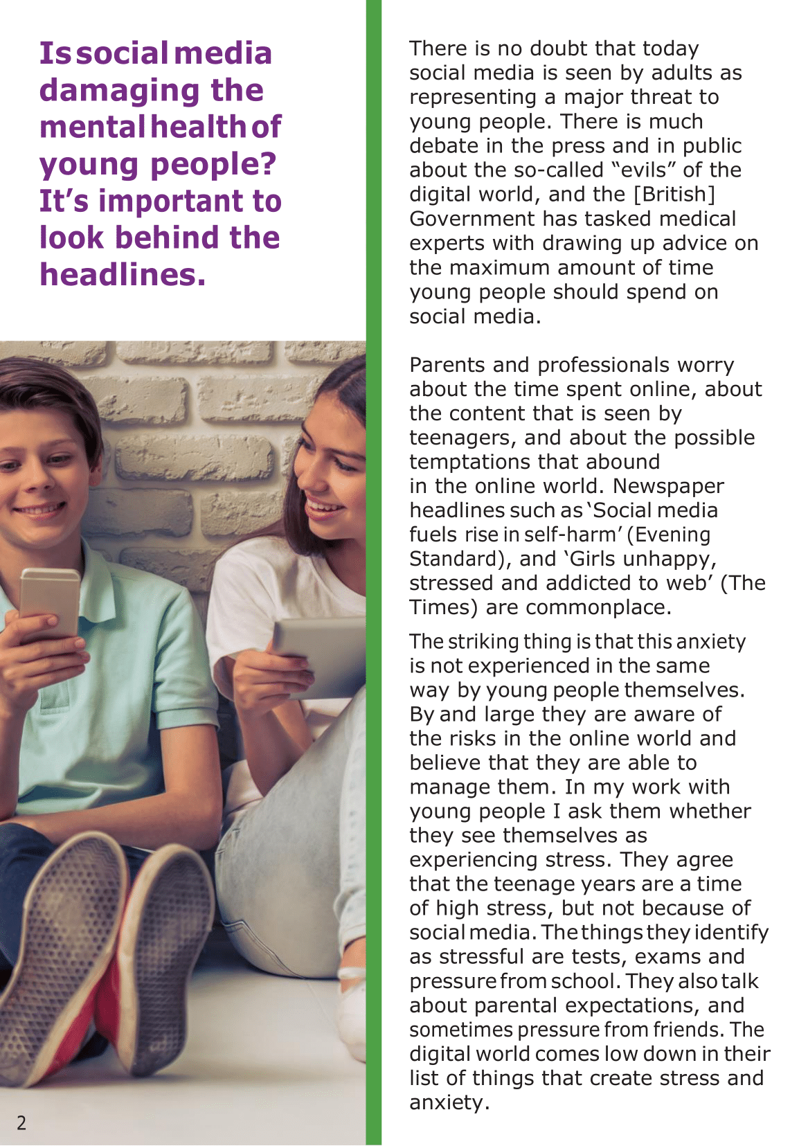 Parents and professionals worry about the time spent online, about the content that is seen by teenagers, and about the possible temptations that abound in the online world. Newspaper headlines such as ‘Social media fuels rise in self-harm’ (Evening Standard), and ‘Girls unhappy, stressed and addicted to web’ (The Times) are commonplace.