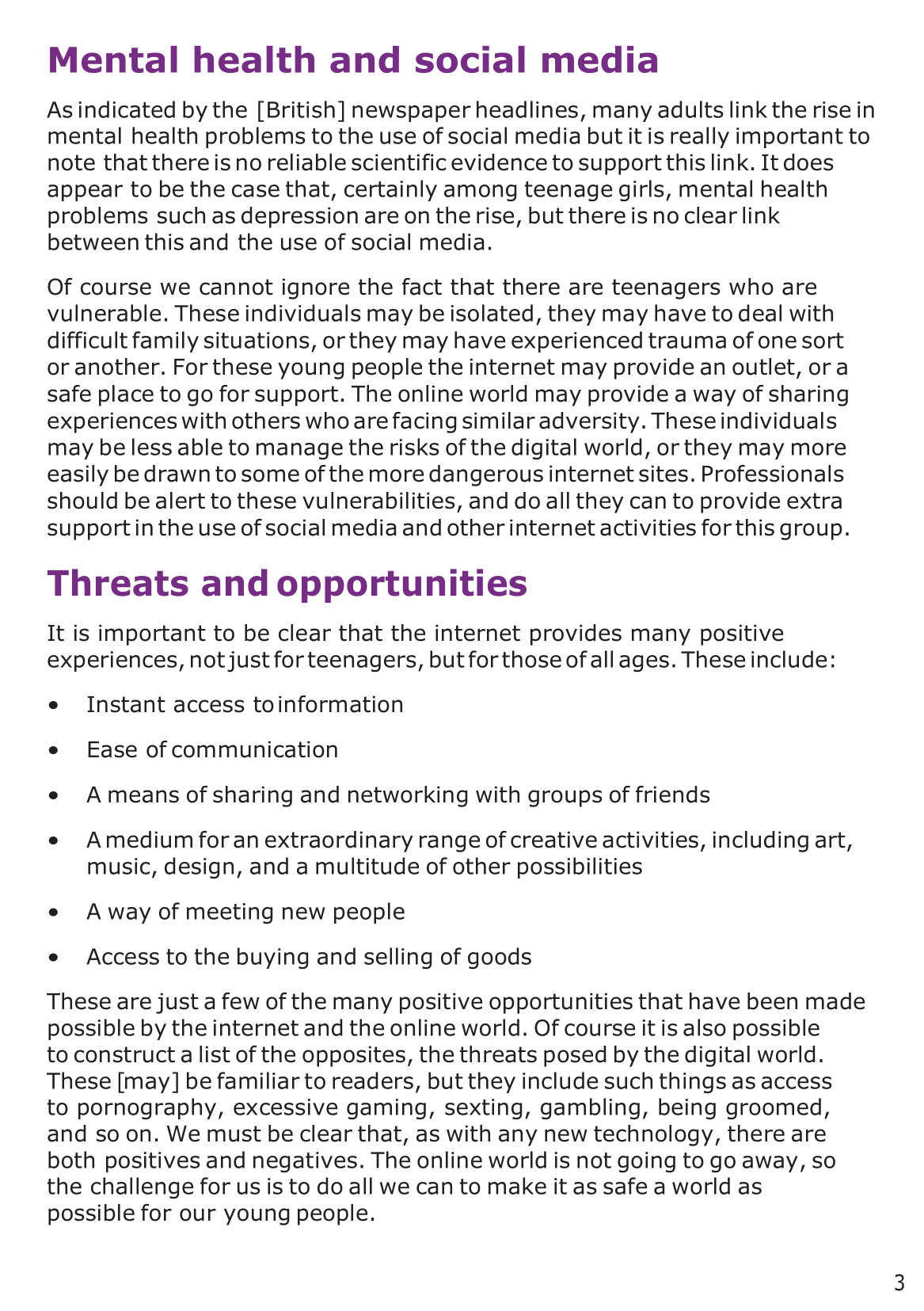 These are just a few of the many positive opportunities that have been made possible by the internet and the online world. Of course it is also possible to construct a list of the opposites, the threats posed by the digital world. These [may] be familiar to readers, but they include such things as access to pornography, excessive gaming, sexting, gambling, being groomed, and so on. We must be clear that, as with any new technology, there are both positives and negatives. The online world is not going to go away, so the challenge for us is to do all we can to make it as safe a world as possible for our young people.