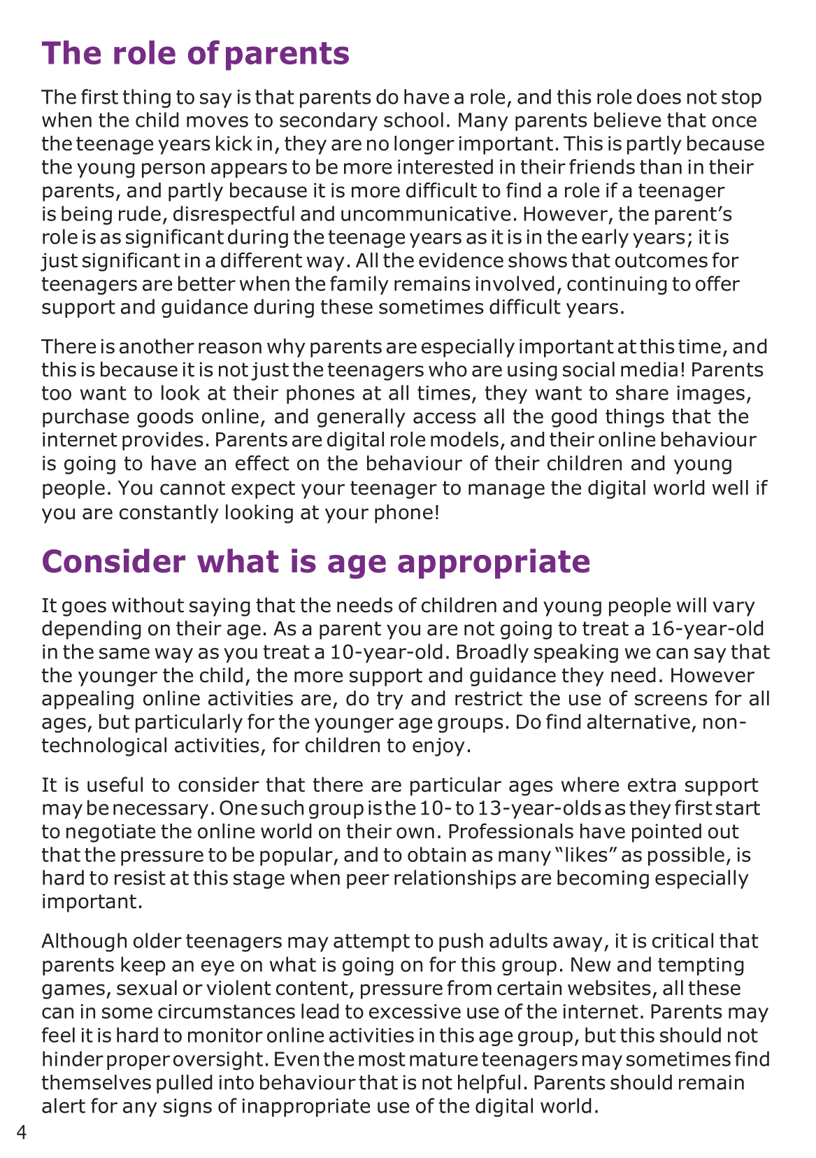 There is another reason why parents are especially important at this time, and this is because it is not just the teenagers who are using social media! Parents too want to look at their phones at all times, they want to share images, purchase goods online, and generally access all the good things that the internet provides. Parents are digital role models, and their online behaviour is going to have an effect on the behaviour of their children and young people. You cannot expect your teenager to manage the digital world well if you are constantly looking at your phone!