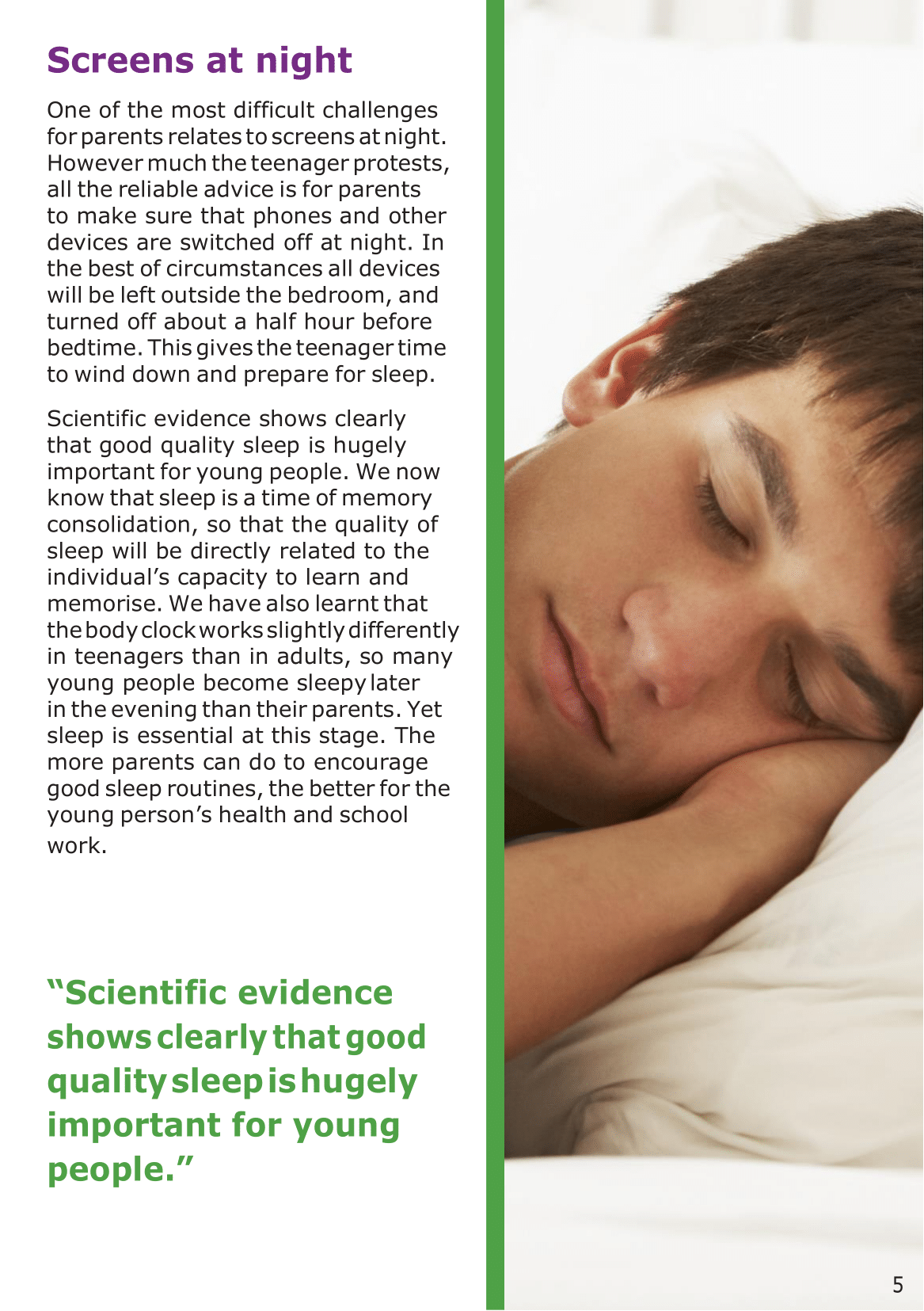 Scientific evidence shows clearly that good quality sleep is hugely important for young people. We now know that sleep is a time of memory consolidation, so that the quality of sleep will be directly related to the individual’s capacity to learn and memorise. We have also learnt that the body clock works slightly differently in teenagers than in adults, so many young people become sleepy later in the evening than their parents. Yet sleep is essential at this stage. The more parents can do to encourage good sleep routines, the better for the young person’s health and school work.
