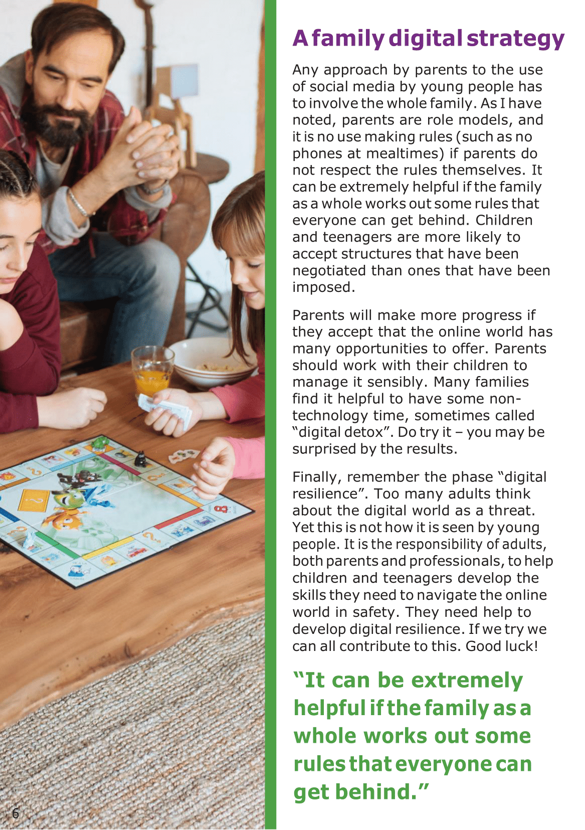 Any approach by parents to the use of social media by young people has to involve the whole family. As I have noted, parents are role models, and it is no use making rules (such as no phones at mealtimes) if parents do not respect the rules themselves. It can be extremely helpful if the family as a whole works out some rules that everyone can get behind. Children and teenagers are more likely to accept structures that have been negotiated than ones that have been imposed.