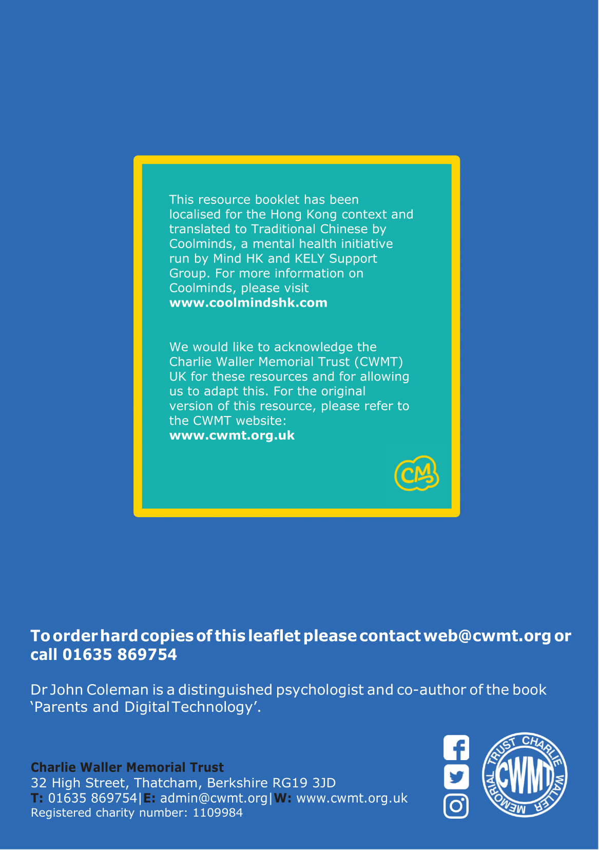This resource booklet has been localised for the Hong Kong context and translated to Traditional Chinese by Coolminds, a mental health initiative run by Mind HK and KELY Support Group. For more information on Coolminds, please visit www.coolmindshk.com