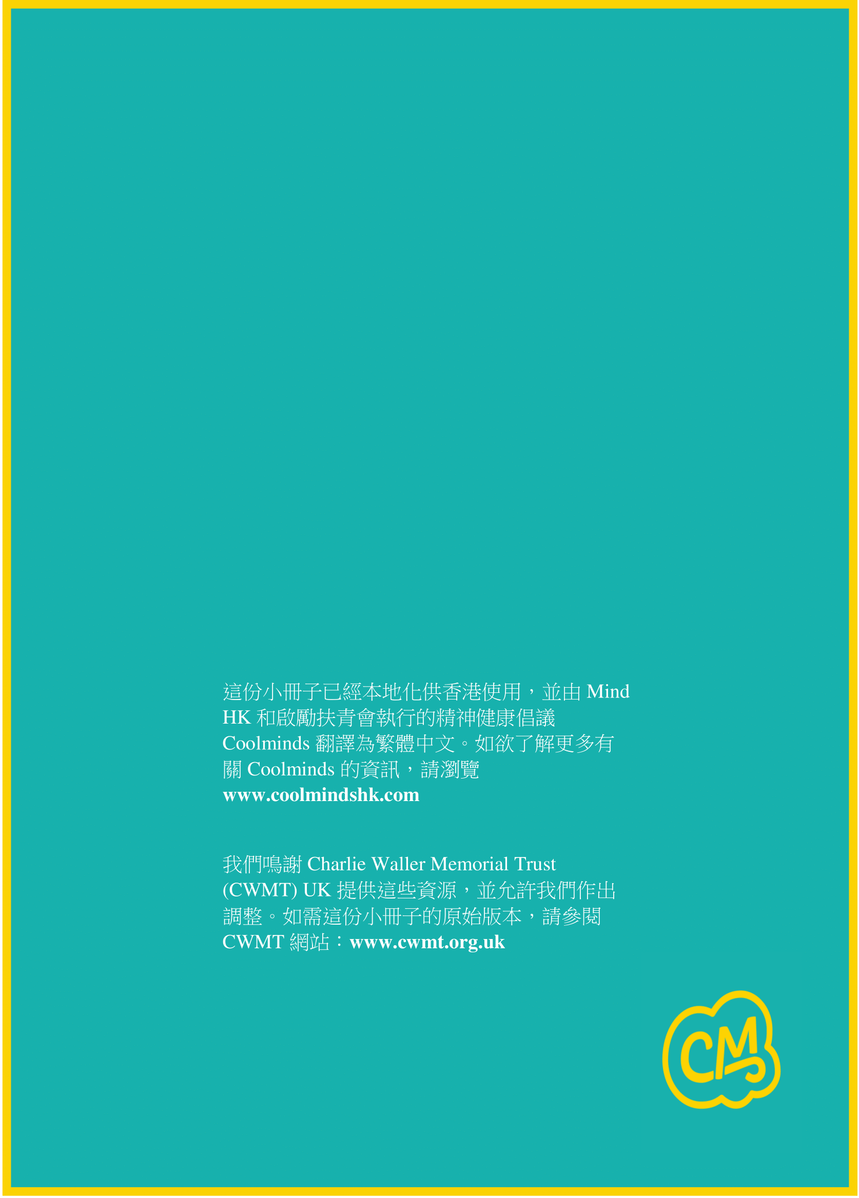 這份小冊子已就供香港使用而本地化,並由 Mind HK 和啟勵扶青共同創立 Coolminds 計劃翻譯為繁體中文。如欲了解更多有關 Coolminds 的資訊,請瀏覽 www.coolmindshk.com