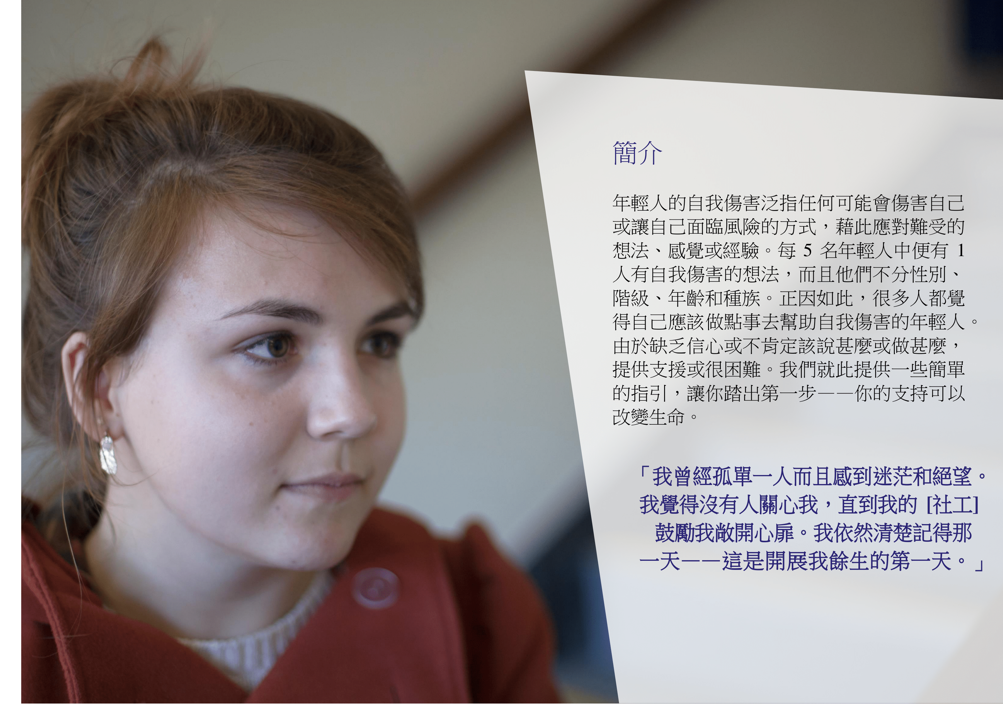 年輕人的自我傷害泛指任何可能會傷害自己或讓自己面臨風險的方式,藉此應對難受的想法、感覺或經驗。每 5 名年輕人中便有 1 人有自我傷害的想法,而且他們不分性別、階級、年齡和種族。正因如此,很多人都覺得自己應該做點事去幫助自我傷害的年輕人。由於缺乏信心或不肯定該說甚麼或做甚麼,提供支援或很困難。我們就此提供一些簡單的指引,讓你踏出第一步——你的支持可以改變生命。