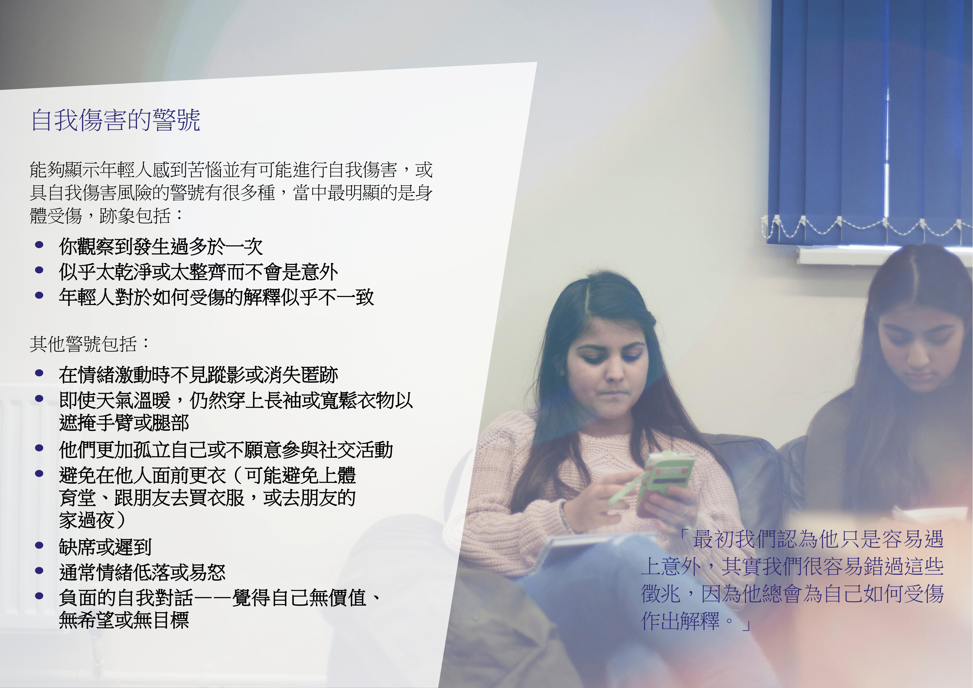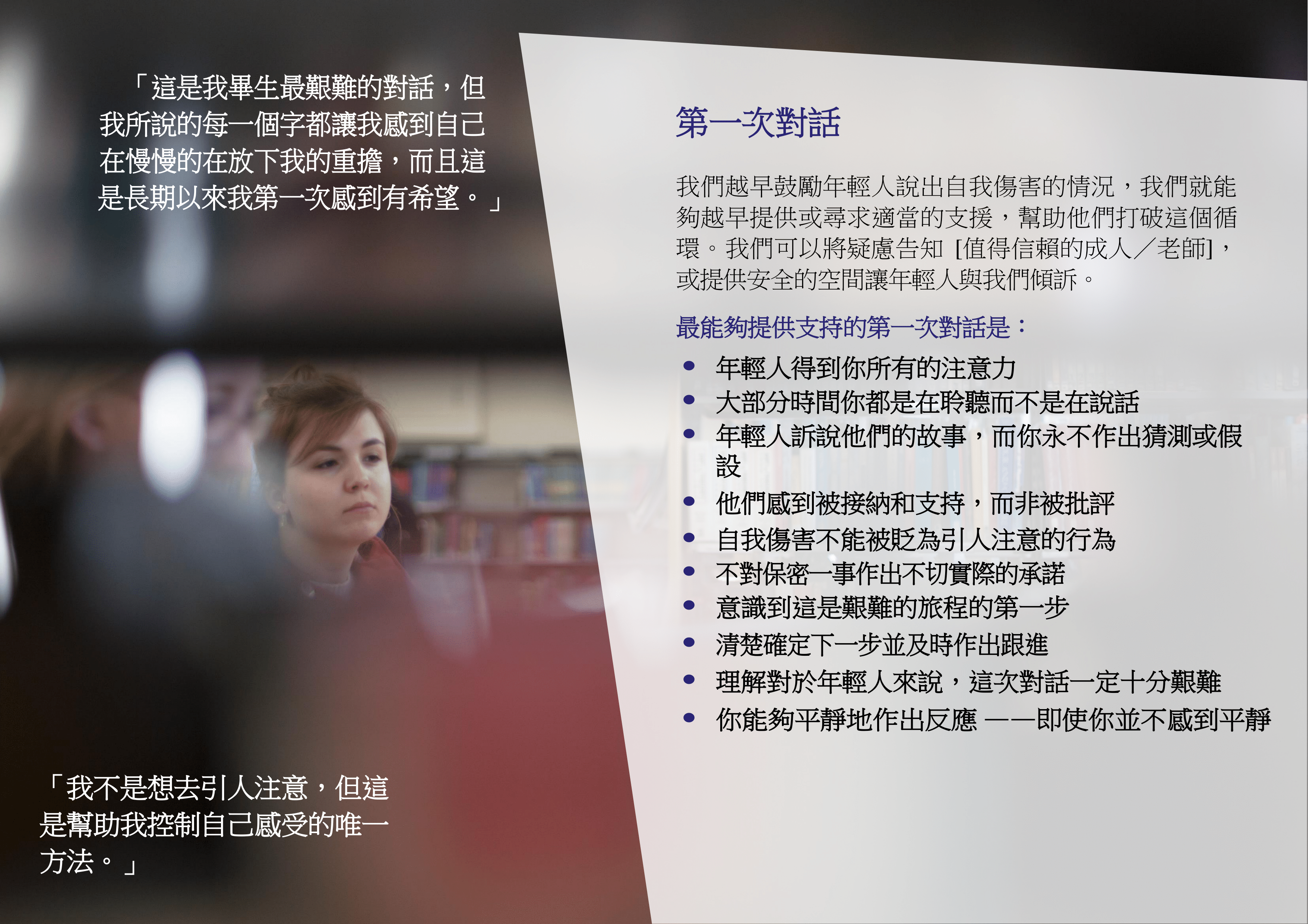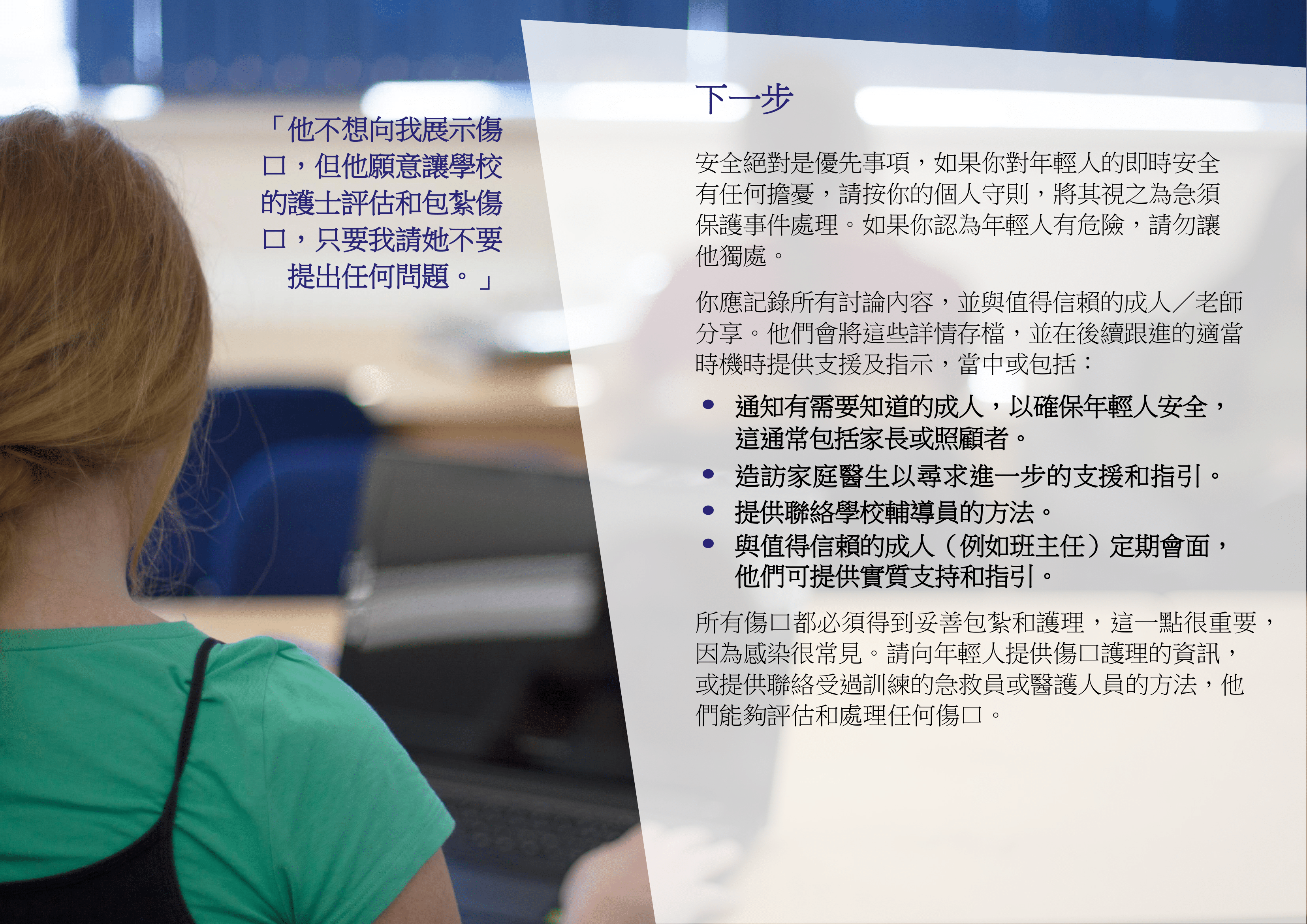 我們越早鼓勵年輕人說出自我傷害的情況,我們就能夠越早提供或尋求適當的支援,幫助他們打破這個循環。我們可以將疑慮告知 [值得信賴的成人/老師],或提供安全的空間讓年輕人與我們傾訴。