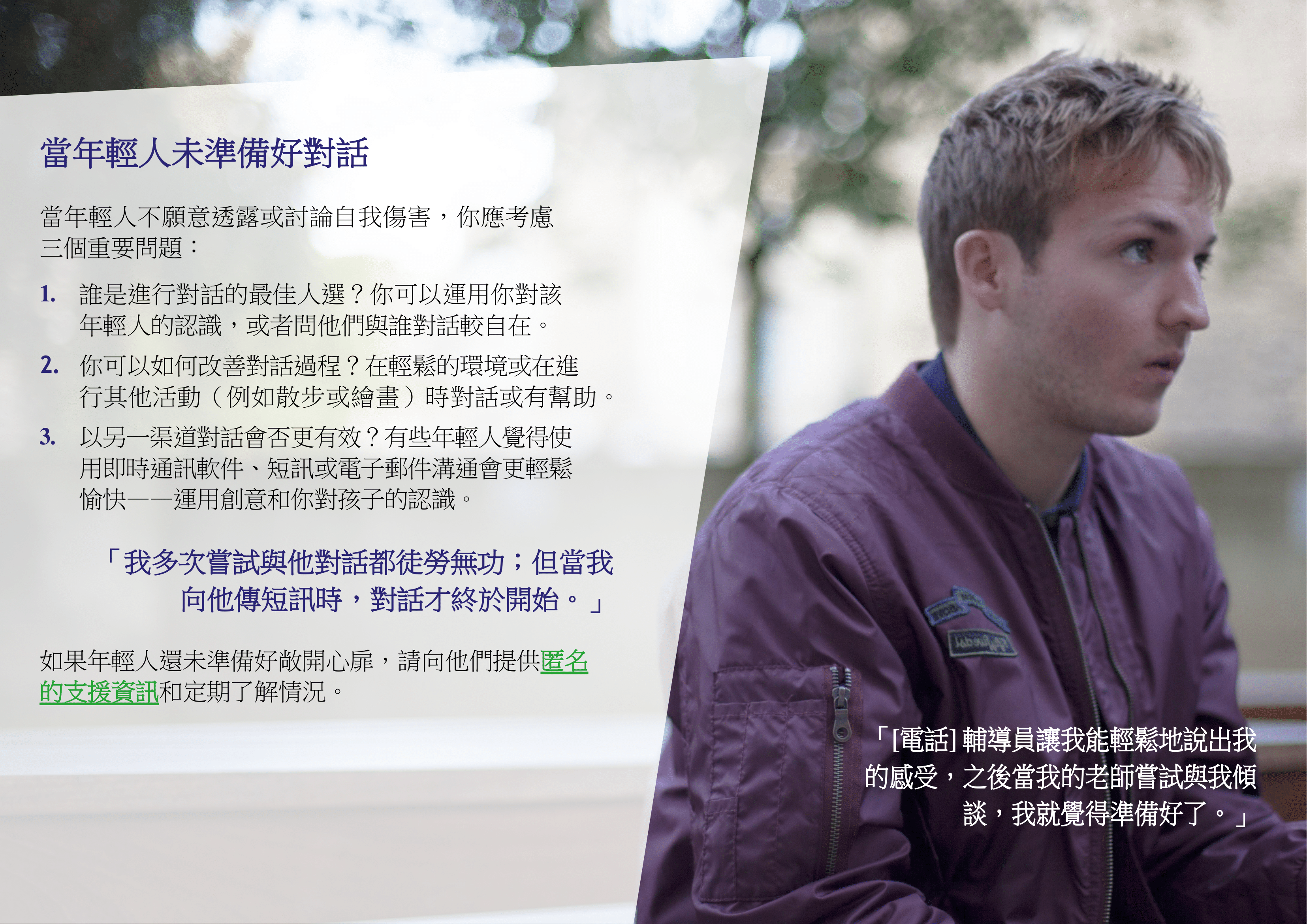 如果年輕人還未準備好敞開心扉,請向他們提供匿名的支援資訊和定期了解情況。