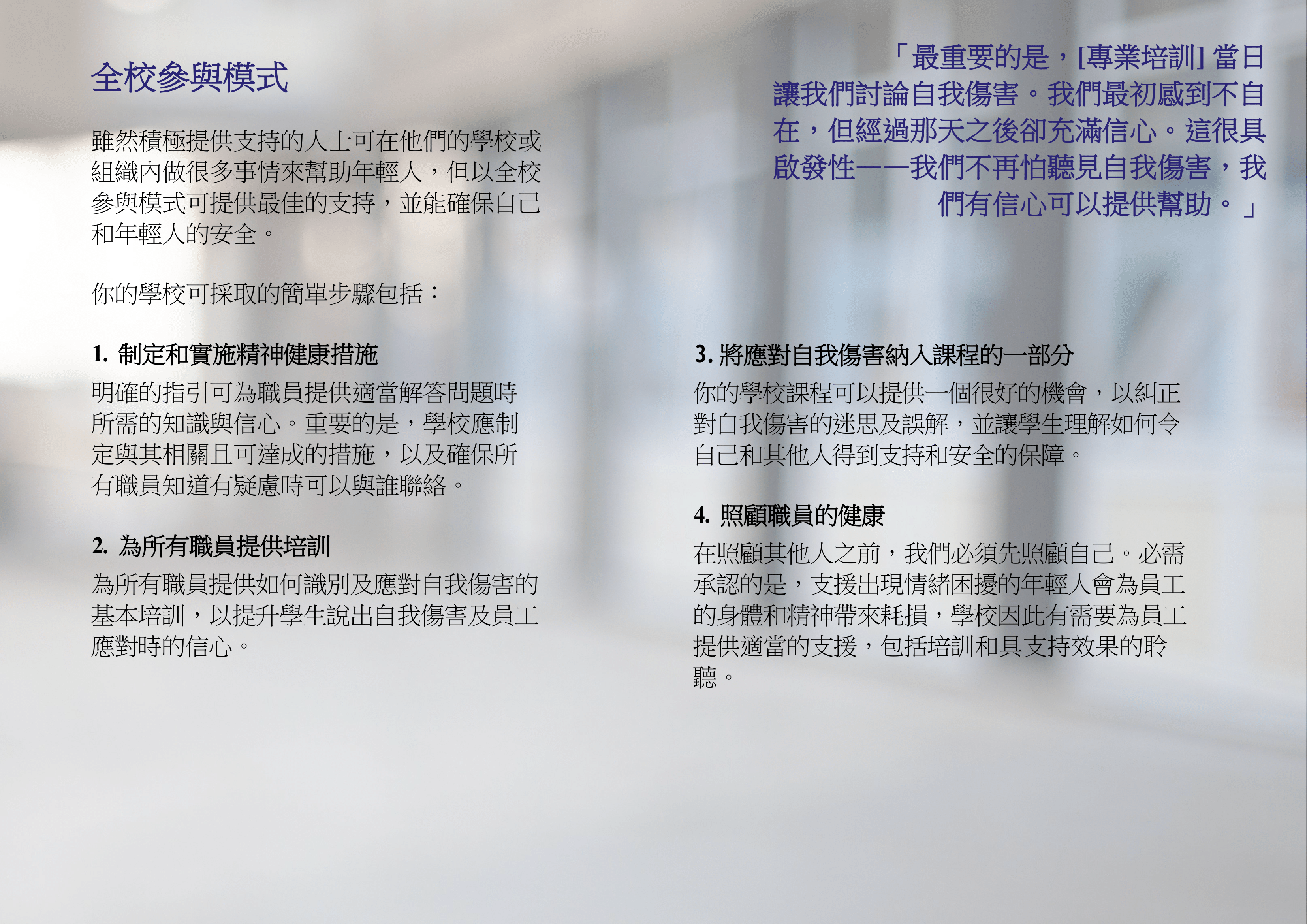 雖然積極提供支持的人士可在他們的學校或組織內做很多事情來幫助年輕人,但以全校參與模式可提供最佳的支持,並能確保自己和年輕人的安全。