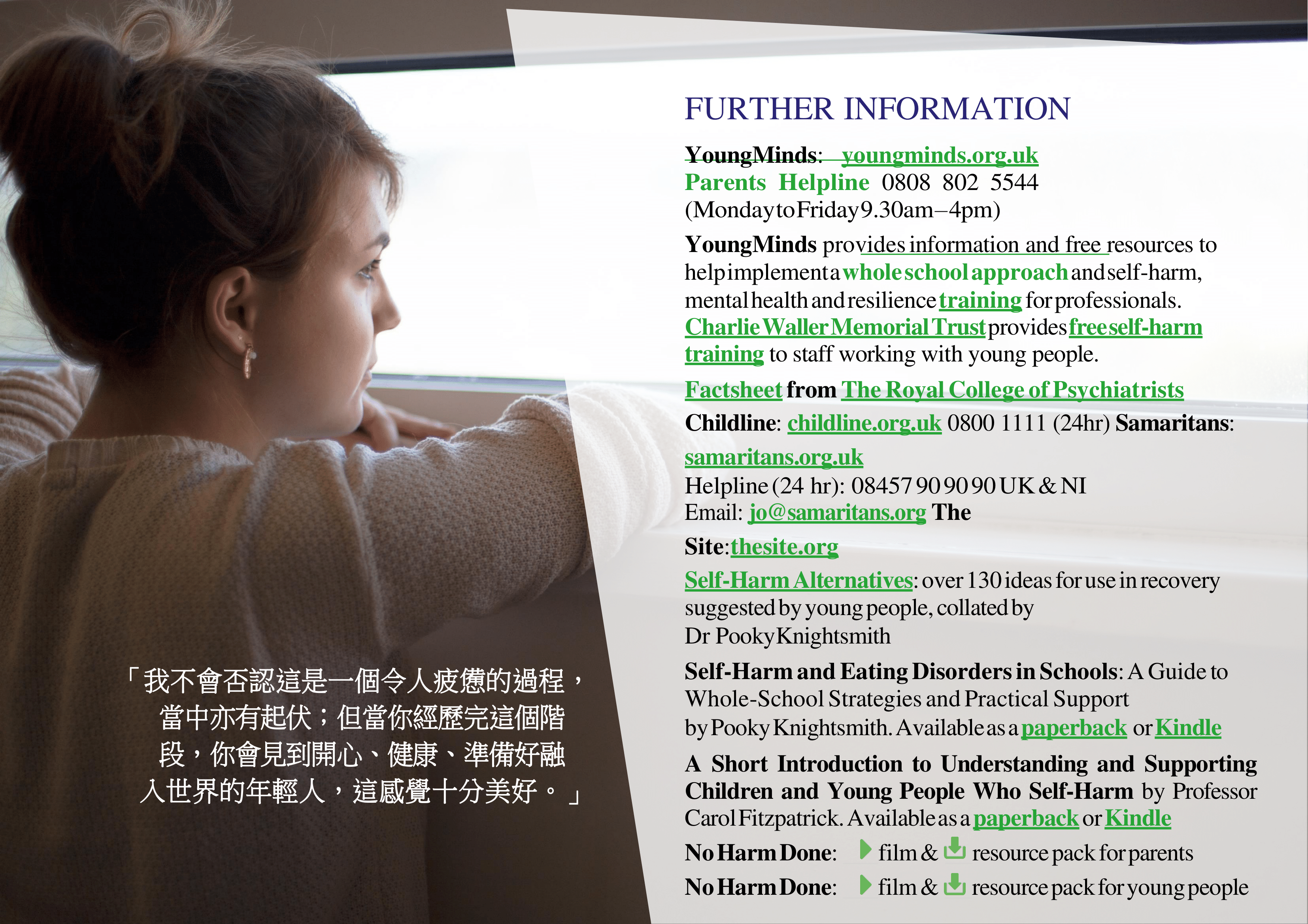 保持你的個人健康——支持自我傷害的年輕人可能為你的情緒帶來挑戰,因此定期獲得支援和保密聆聽對你來說也很重要。與值得信賴的成人/老師保持定期聯絡,假如有任何原因令你認為自己無法繼續為年輕人提供支援,請盡早提出。