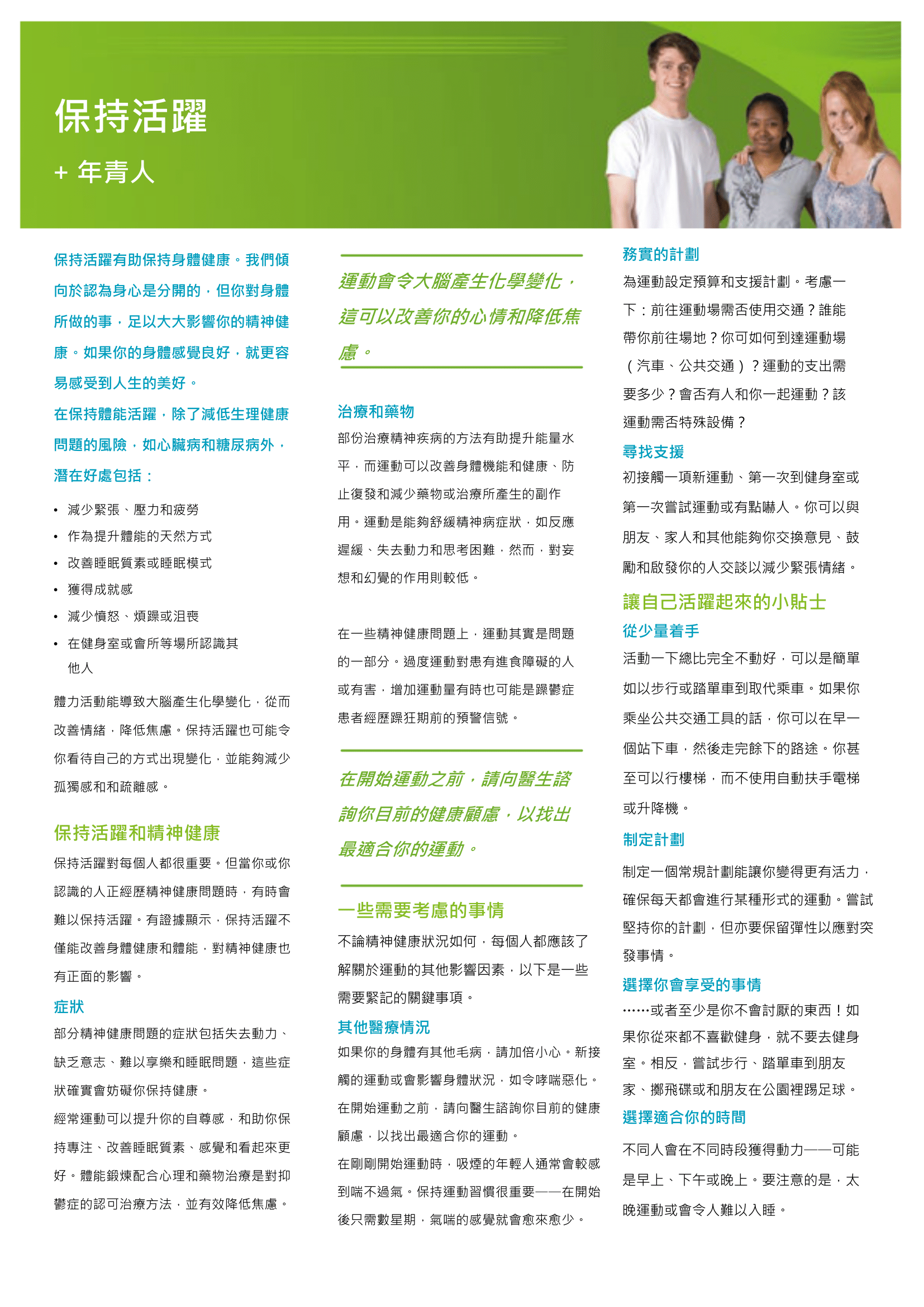 保持活躍對每個人都很重要。但當你或你認識的人正經歷精神健康問題時,有時會難以保持活躍。有證據顯示,保持活躍不僅能改善身體健康和體能,對精神健康也有正面的影響。