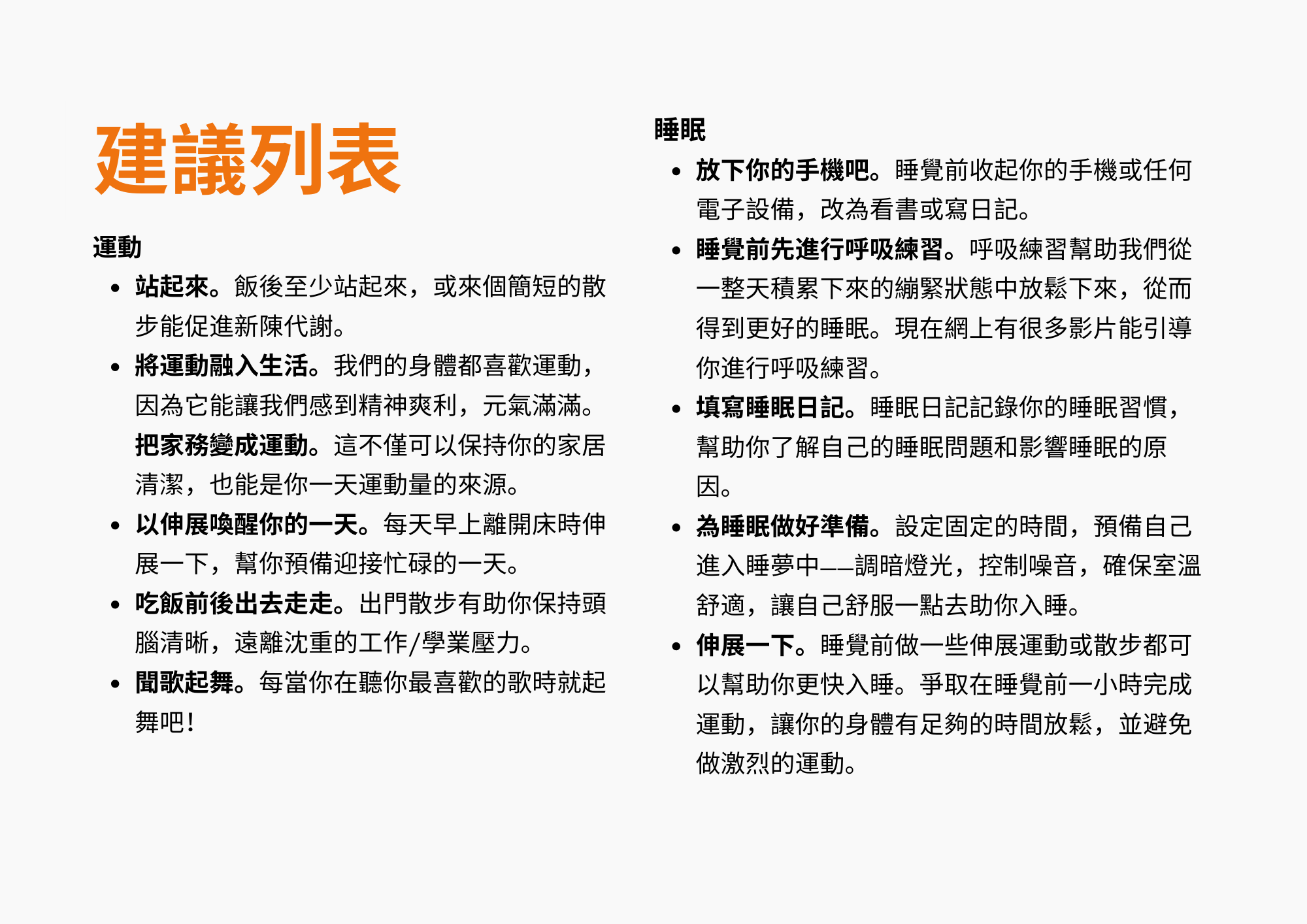 - 伸展一下。睡覺前做一些伸展運動或散步都可以幫助你更快入睡。爭取在睡覺前一小時完成運動,讓你的身體有足夠的時間放鬆,並避免做激烈的運動。