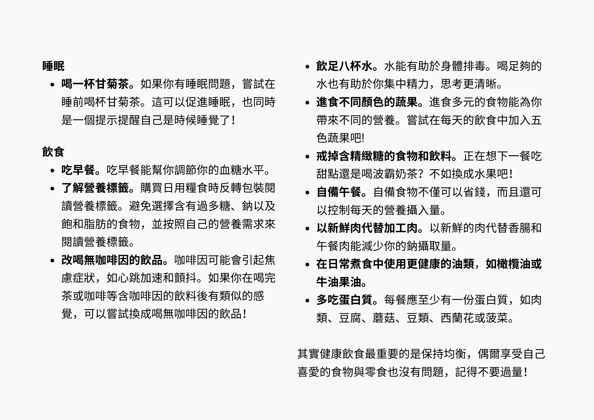 - 為睡眠做好準備。設定固定的時間,預備自己進入睡夢中 — 調暗燈光,控制噪音,確保室溫舒適,讓自己舒服一點去助你入睡。