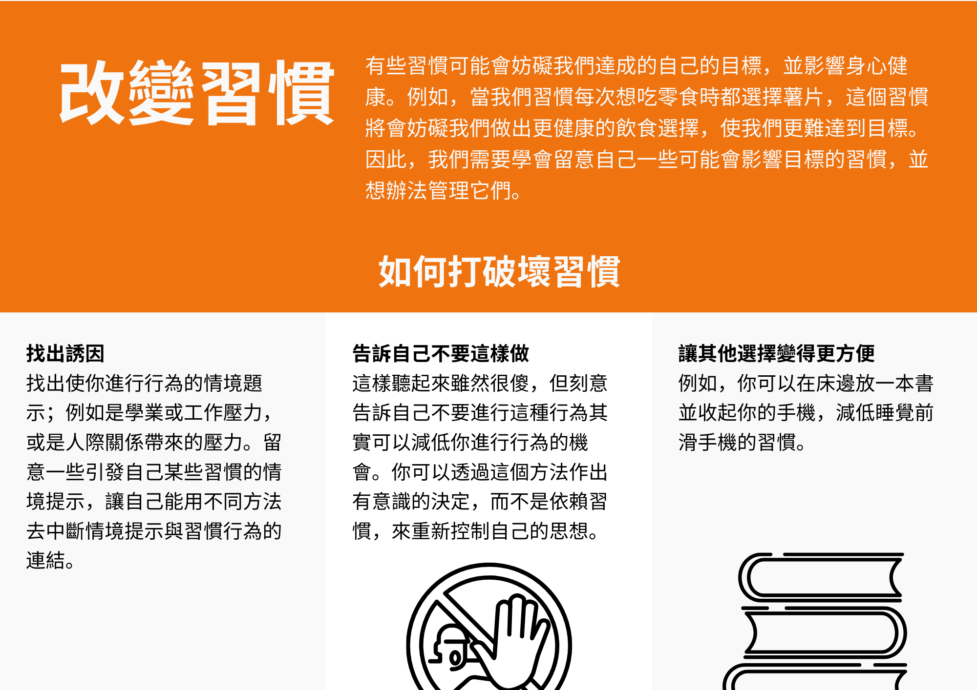 有些習慣可能會妨礙我們達成的自己的目標,並影響身心健康。例如,當我們習慣每次想吃零食時都選擇薯片,這個習慣將會妨礙我們做出更健康的飲食選擇,使我們更難達到目標。因此,我們需要學會留意自己一些可能會影響目標的習慣,並想辦法管理它們。