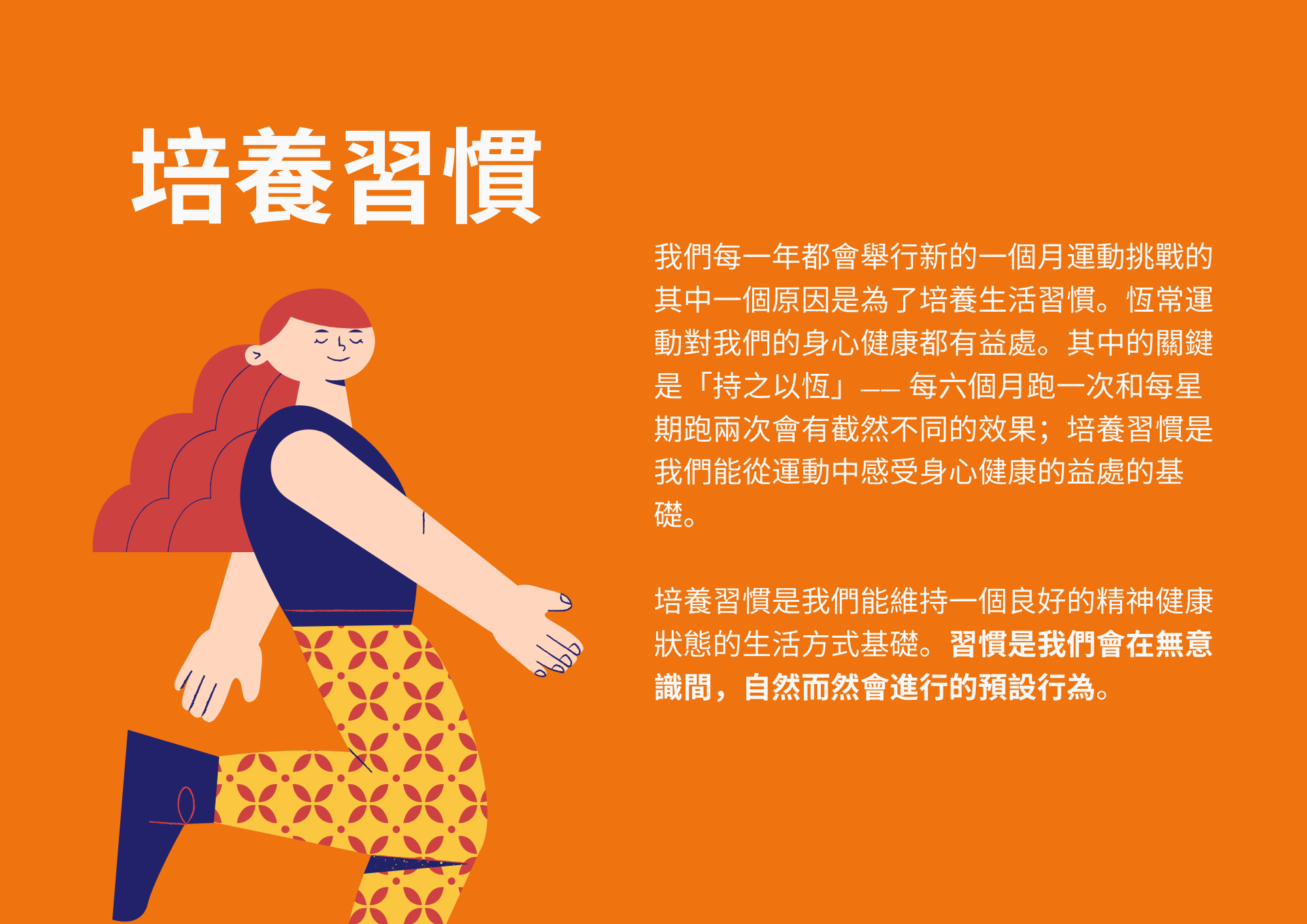 我們每一年都會舉行新的一個月運動挑戰的其中一個原因是為了培養生活習慣。恆常運動對我們的身心健康都有益處。其中的關鍵是「持之以恆」— 每六個月跑一次和每星期跑兩次會有截然不同的效果;培養習慣是我們能從運動中感受身心健康的益處的基礎。