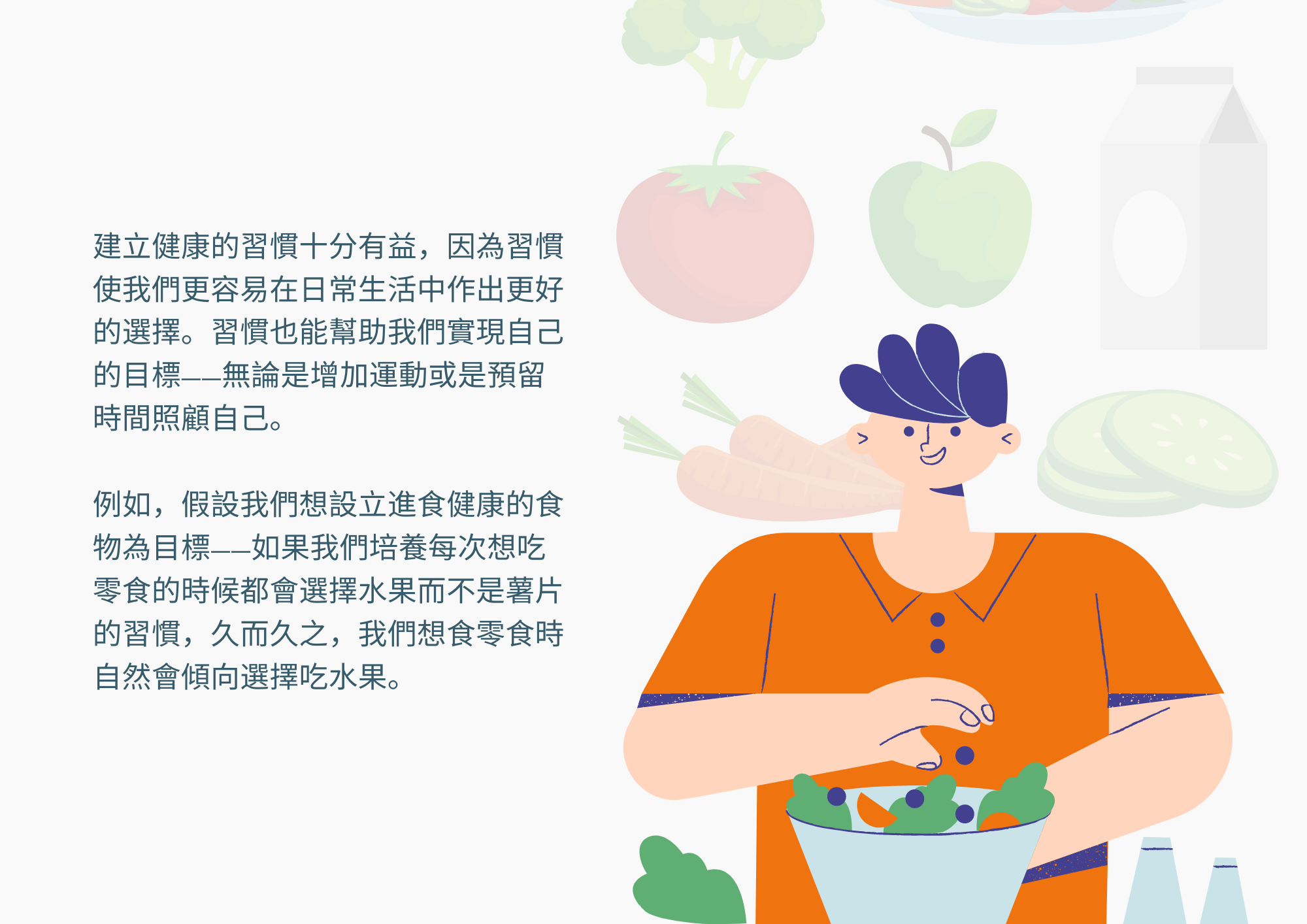 例如,假設我們想設立進食健康的食物為目標 — 如果我們培養每次想吃零食的時候都會選擇水果而不是薯片的習慣,久而久之,我們想食零食時自然會傾向選擇吃水果。