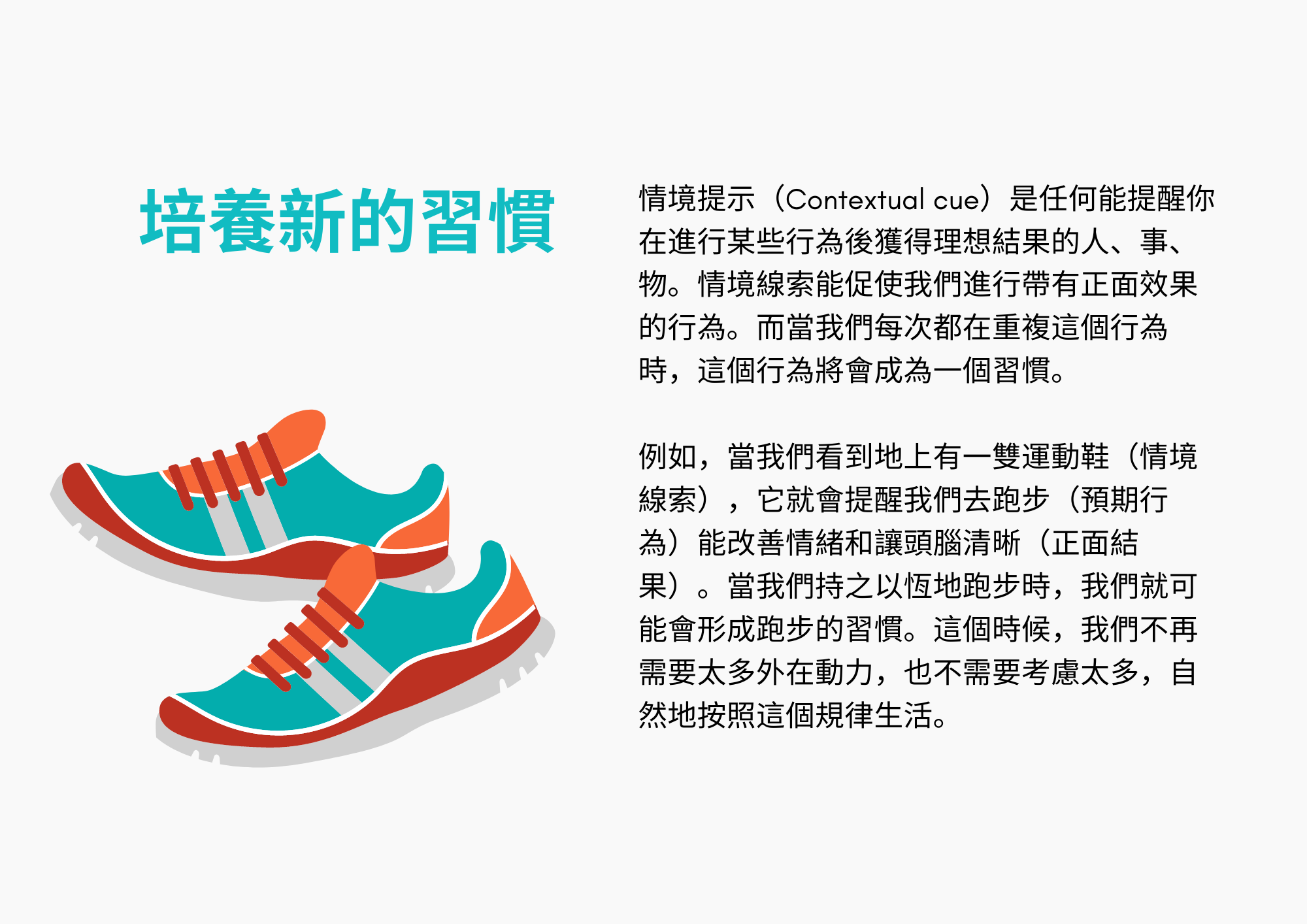 例如,當我們看到地上有一雙運動鞋(情境線索),它就會提醒我們去跑步(預期行為)能改善情緒和讓頭腦清晰(正面結果)。當我們持之以恆地跑步時,我們就可能會形成跑步的習慣。這個時候,我們不再需要太多外在動力,也不需要考慮太多,自然地按照這個規律生活。