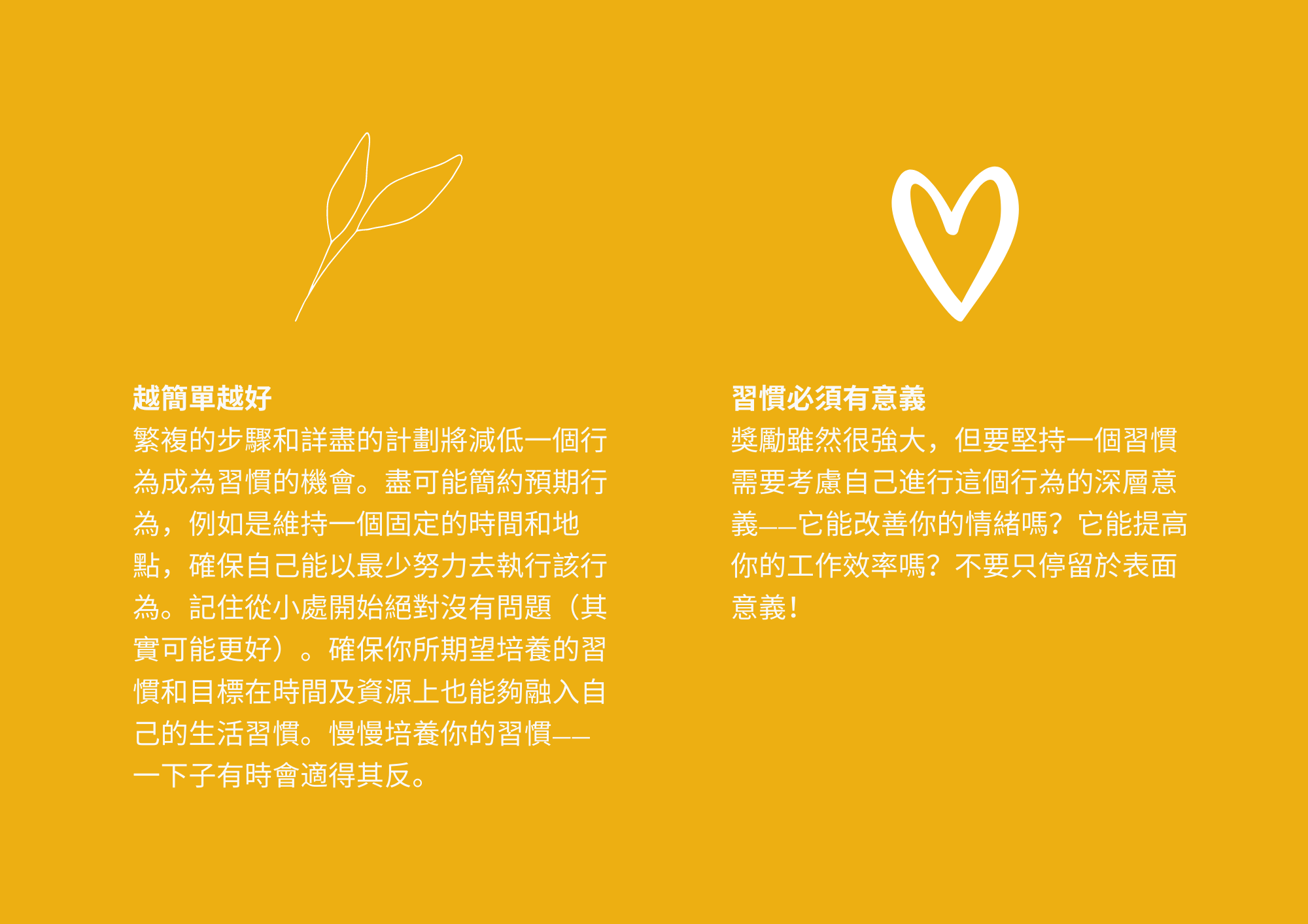 - 習慣必須有意義。獎勵雖然很強大,但要堅持一個習慣需要考慮自己進行這個行為的深層意義 — 它能改善你的情緒嗎?它能提高你的工作效率嗎?不要只停留於表面意義!