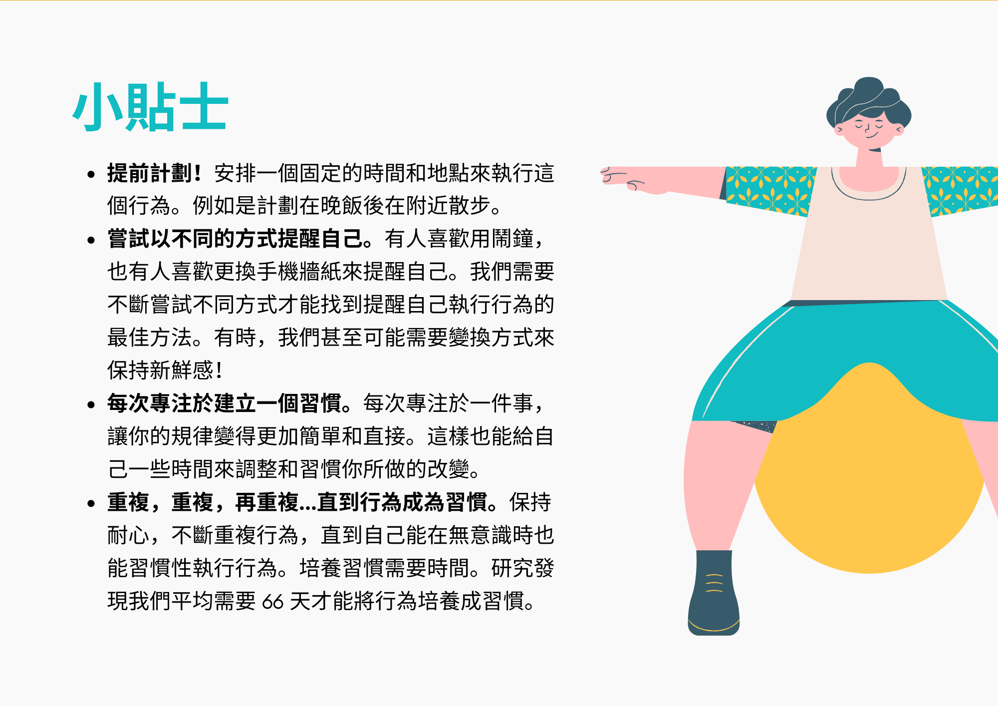 - 每次專注於建立一個習慣。每次專注於一件事,讓你的規律變得更加簡單和直接。這樣也能給自己一些時間來調整和習慣你所做的改變。