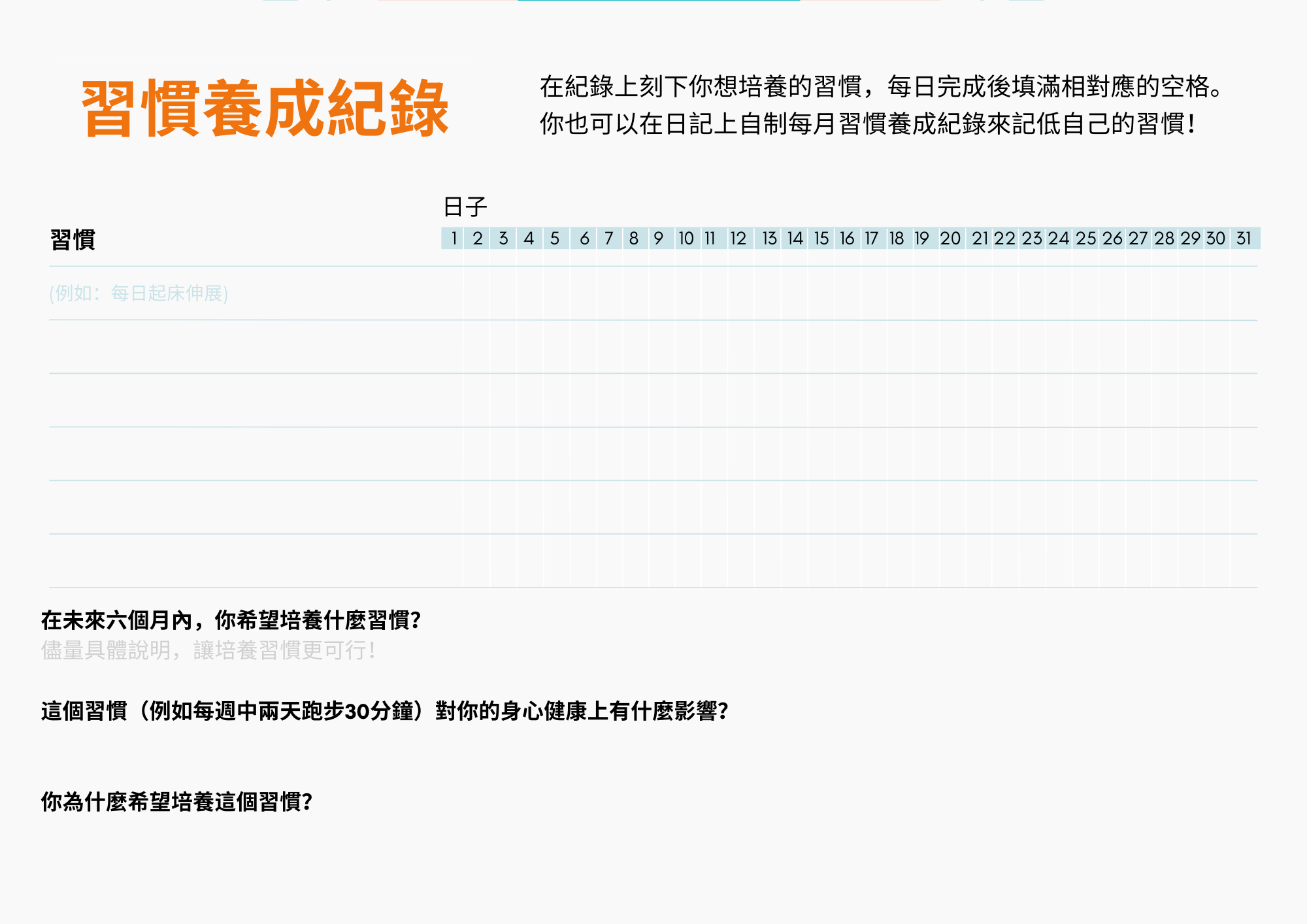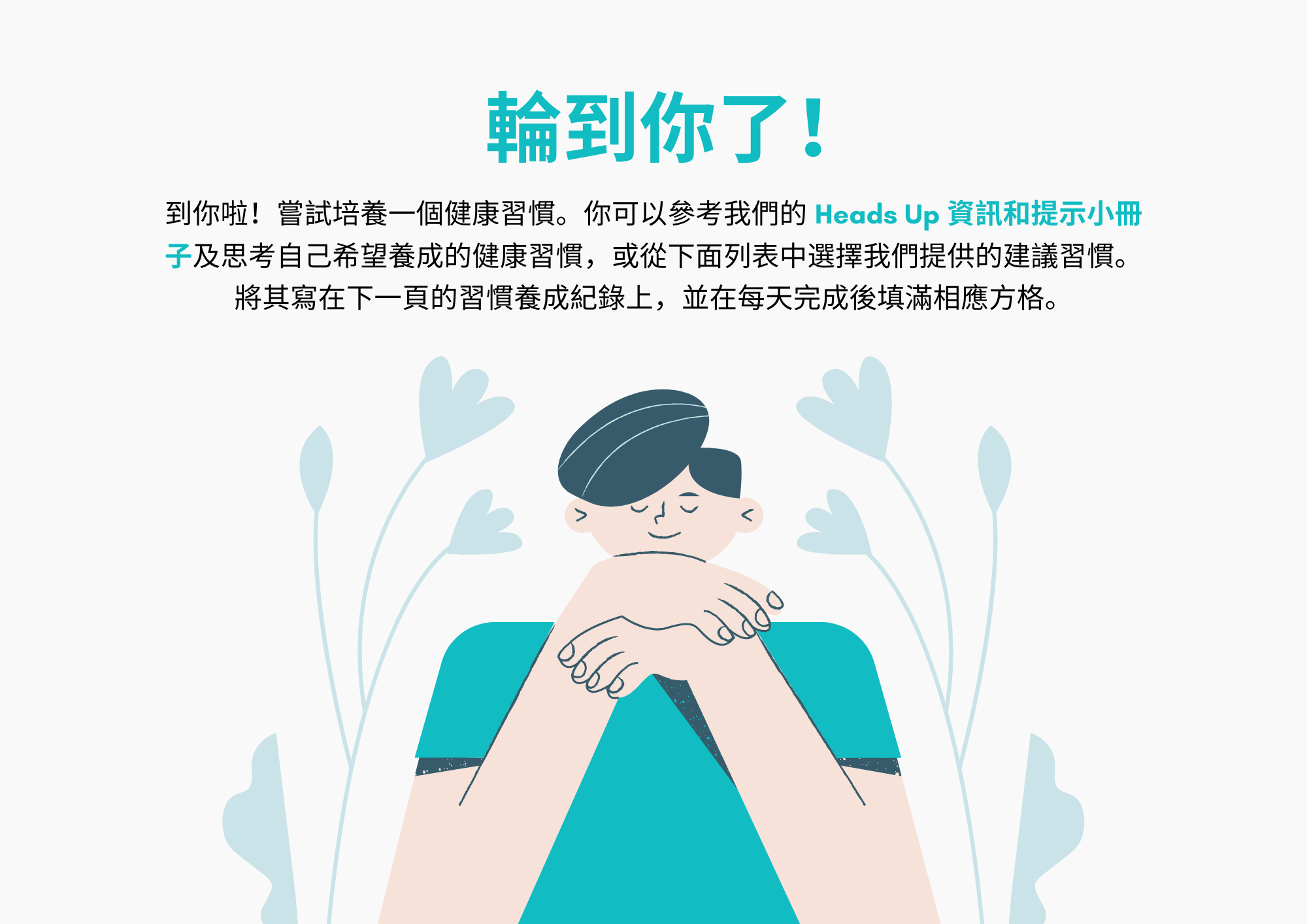 到你啦!嘗試培養一個健康習慣。你可以參考我們的 Heads Up 資訊和提示小冊子及思考自己希望養成的健康習慣,或從列表中選擇我們提供的建議習慣。將其寫在習慣養成紀錄上,並在每天完成後填滿相應方格。