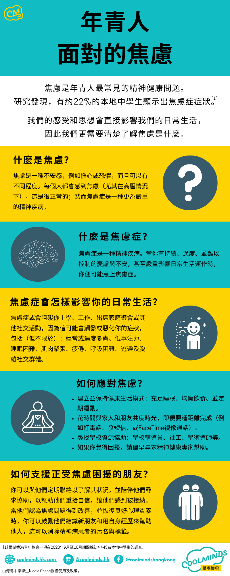 根據香港青年協會一項在2020年9月至10月期間採訪4,443名本地中學生的調查發現,有約22%的本地中學⽣顯示出焦慮症症狀。