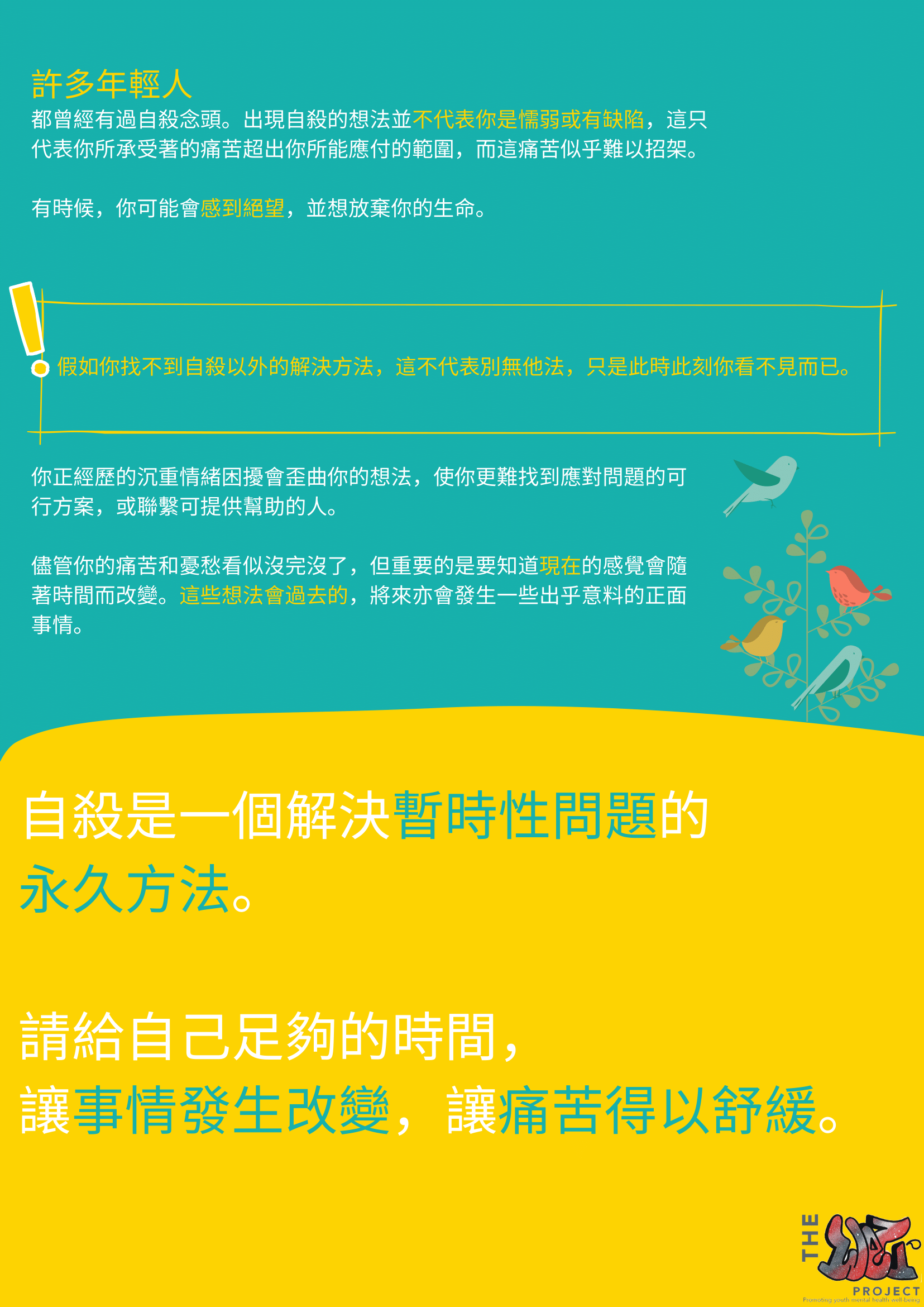 只要有⾜夠時間和⽀援,你定能克服你的問題,你的痛苦和⾃殺念頭亦會過去的。
