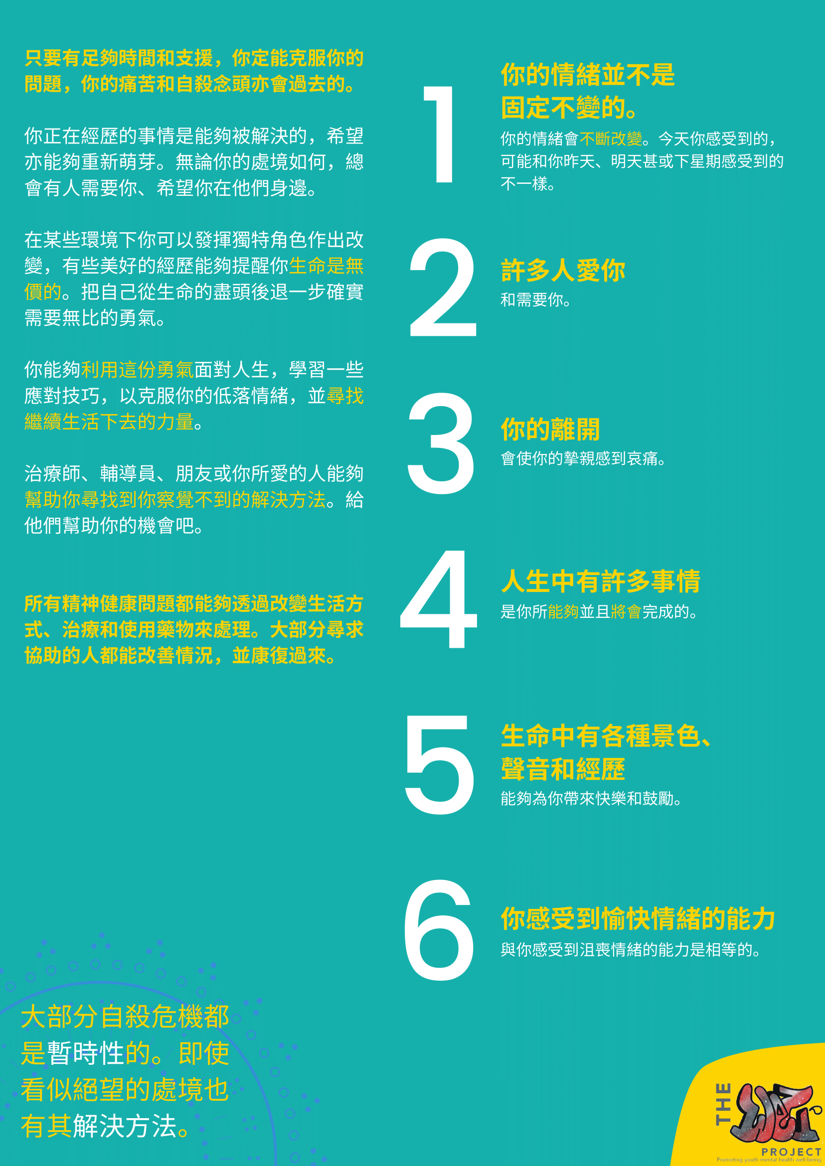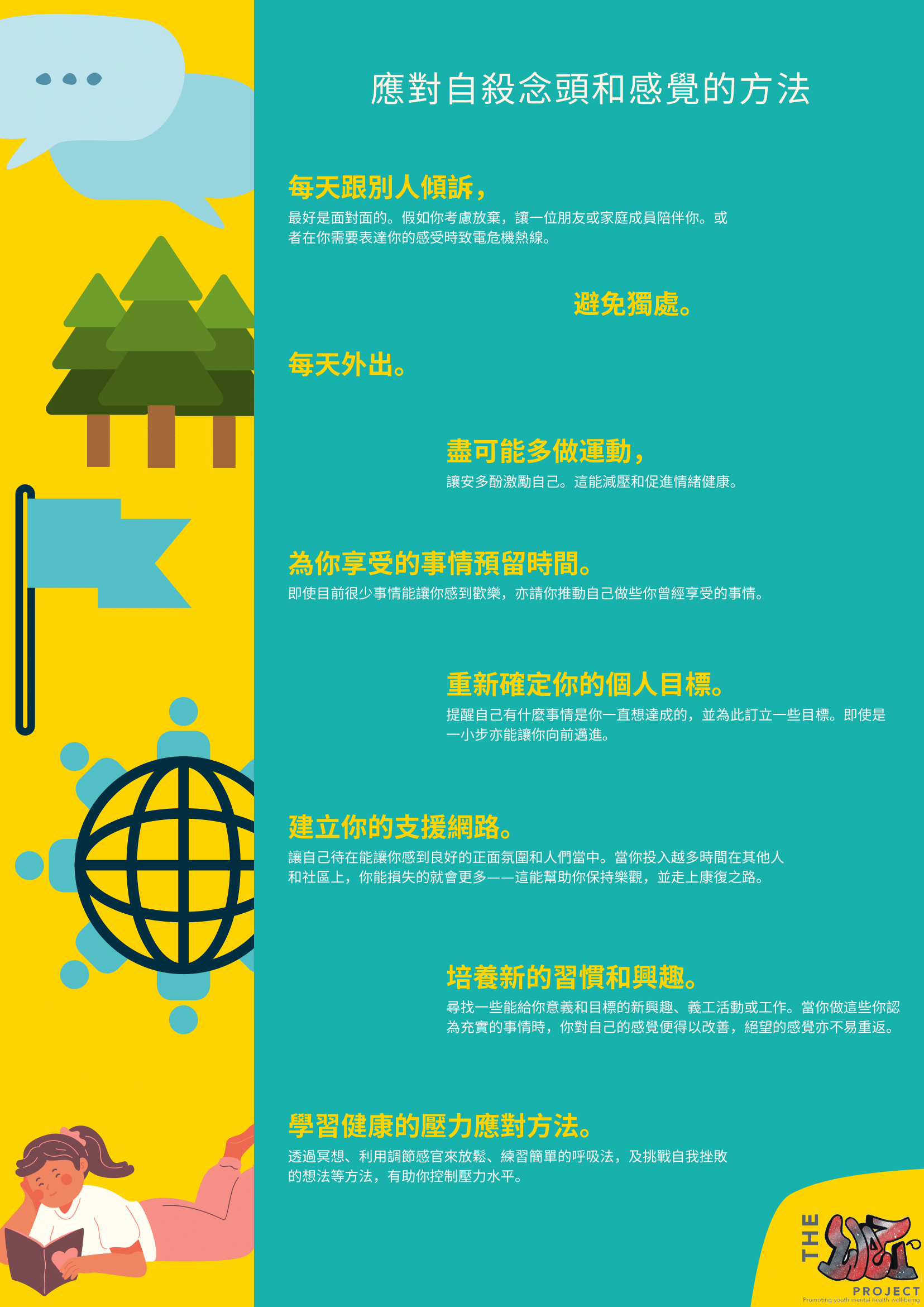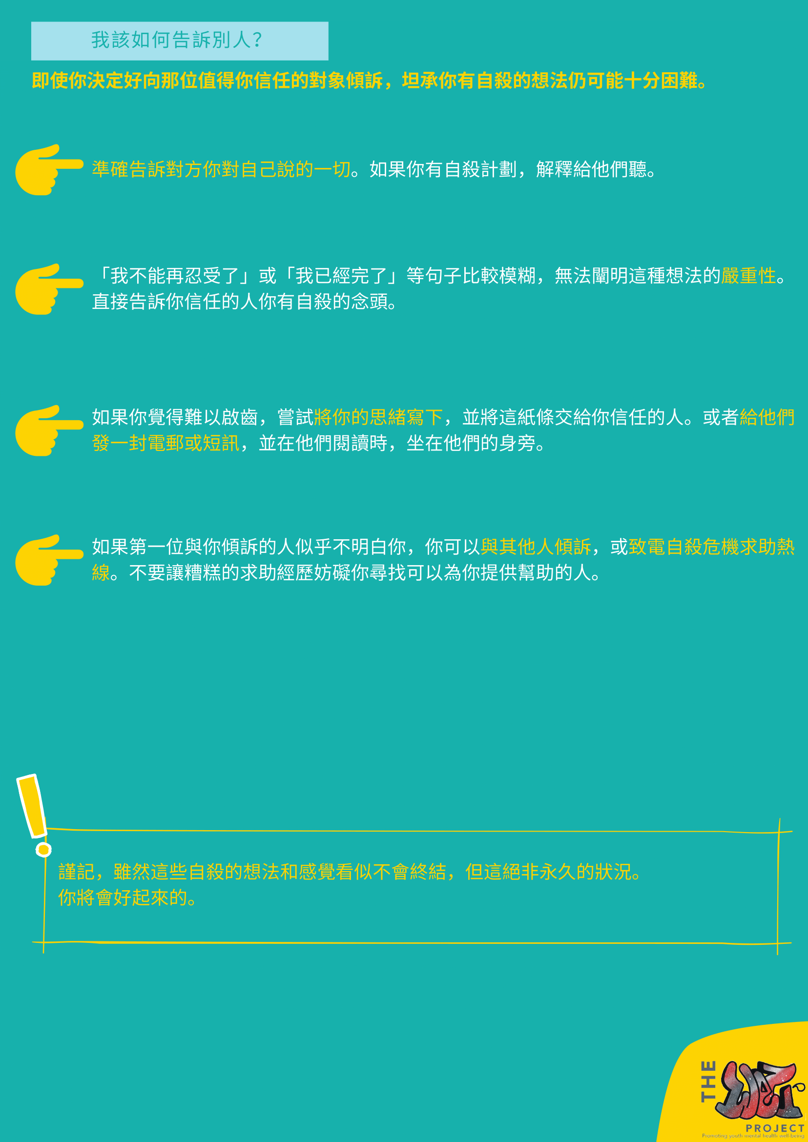 謹記,雖然這些⾃殺的想法和感覺看似不會終結,但這絕⾮永久的狀況。你將會好起來的。