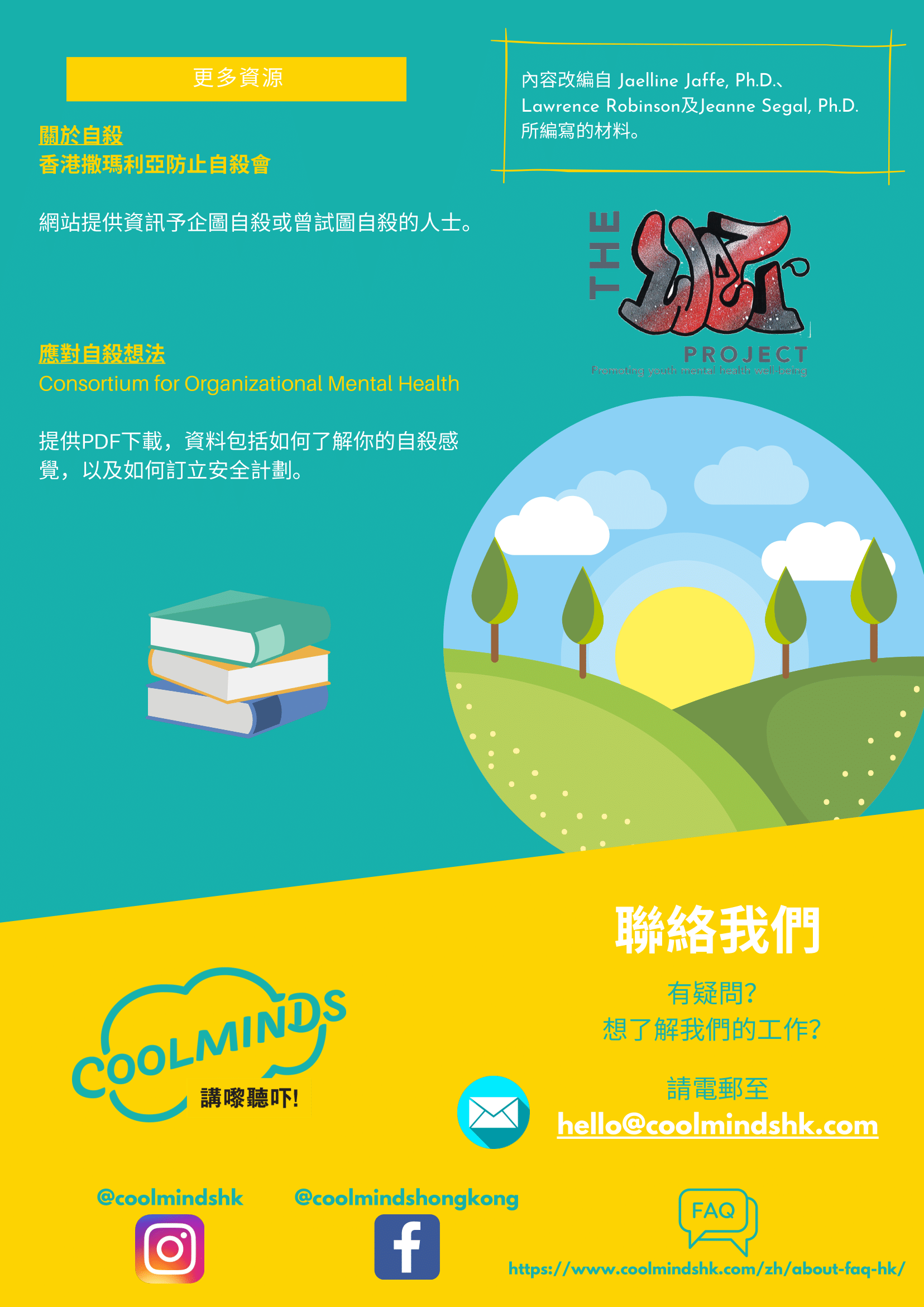 提供PDF下載,資料包括如何了解你的⾃殺感覺,以及如何訂⽴安全計劃。