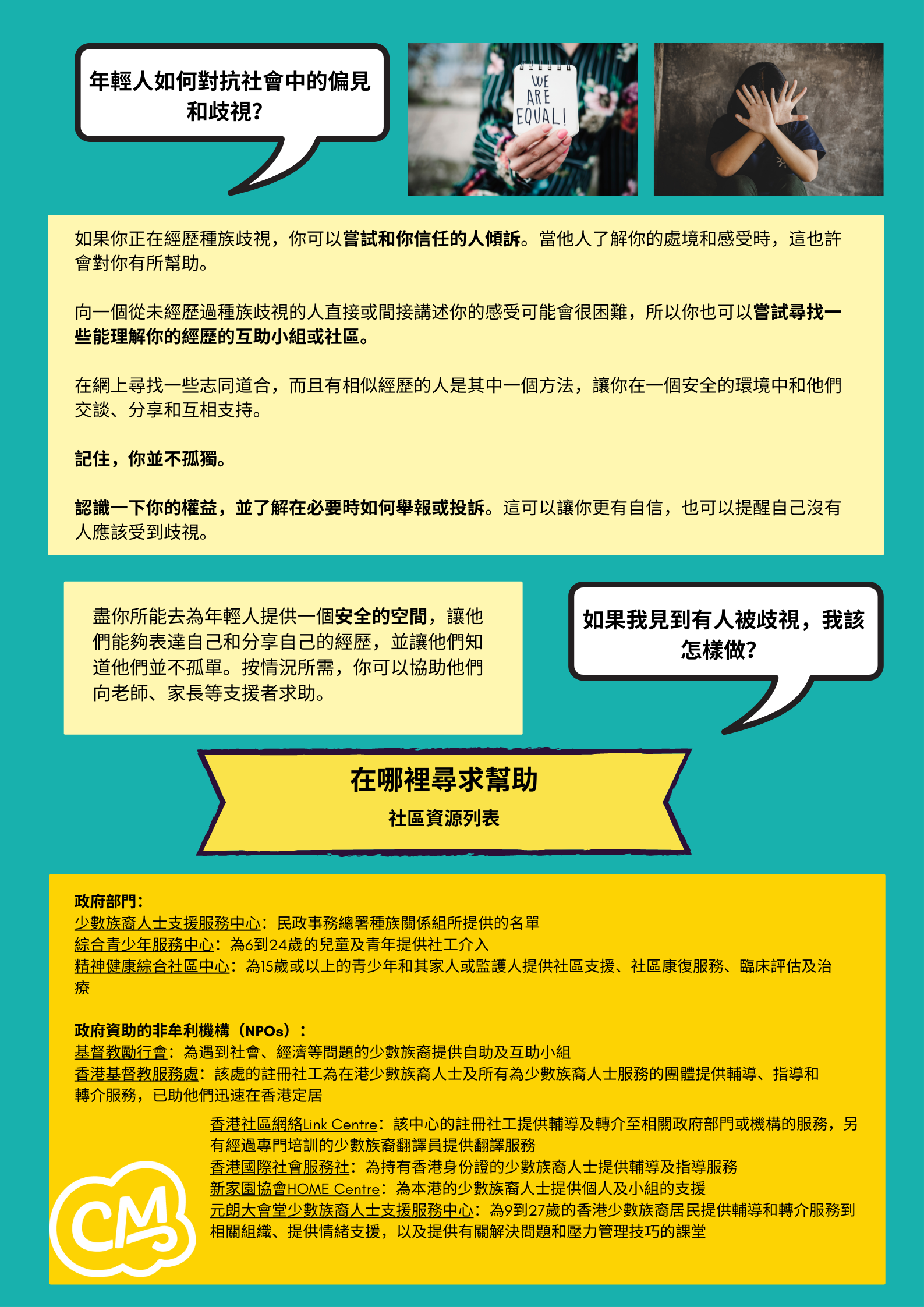如果你正在經歷種族歧視,你可以嘗試和你信任的⼈傾訴。當他⼈了解你的處境和感受時,這也許會對你有所幫助。
