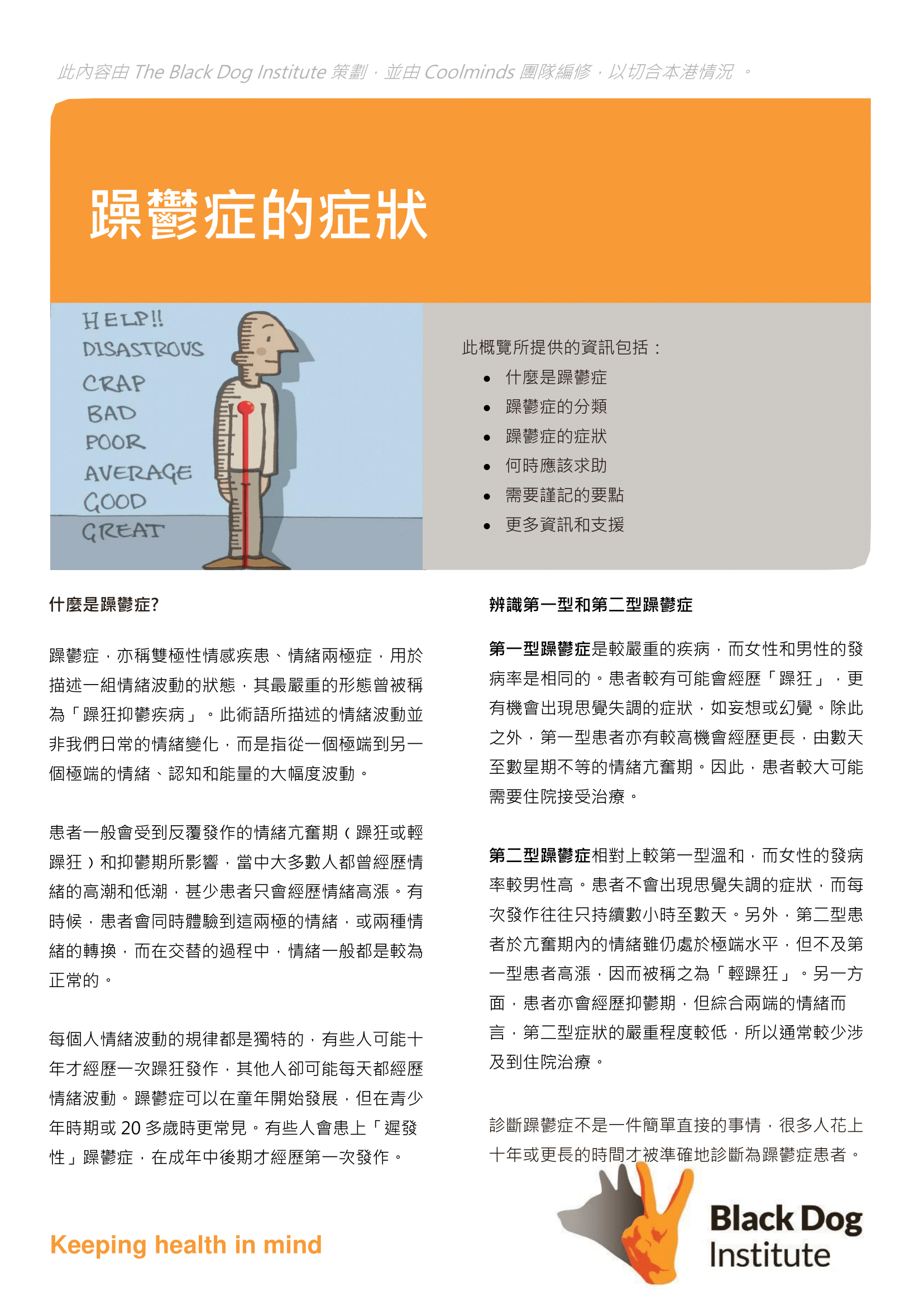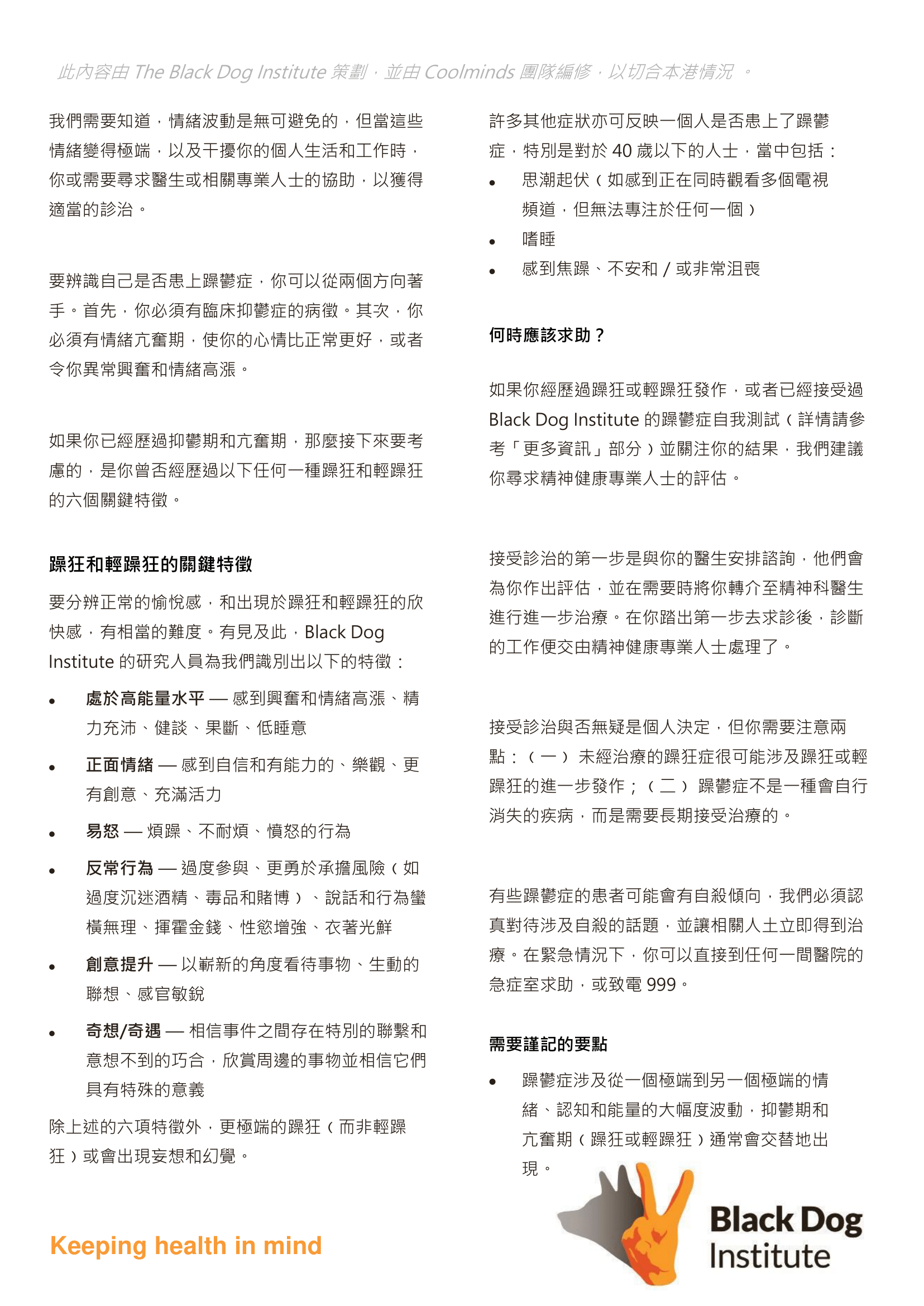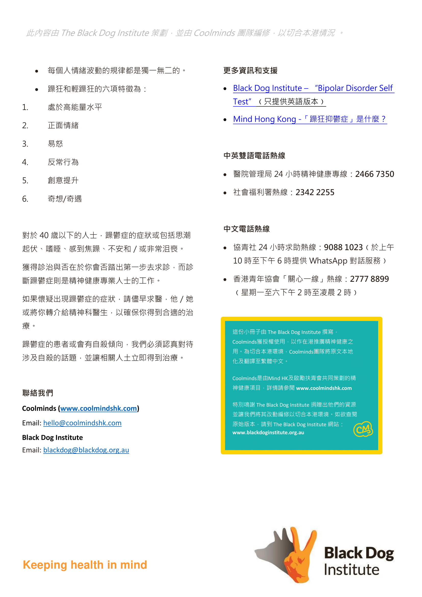 這份小冊子由 The Black Dog Institute 撰寫,Coolminds獲授權使用,以作在港推廣精神健康之用。為切合本港環境,Coolminds團隊將原文本地化及翻譯至繁體中文。